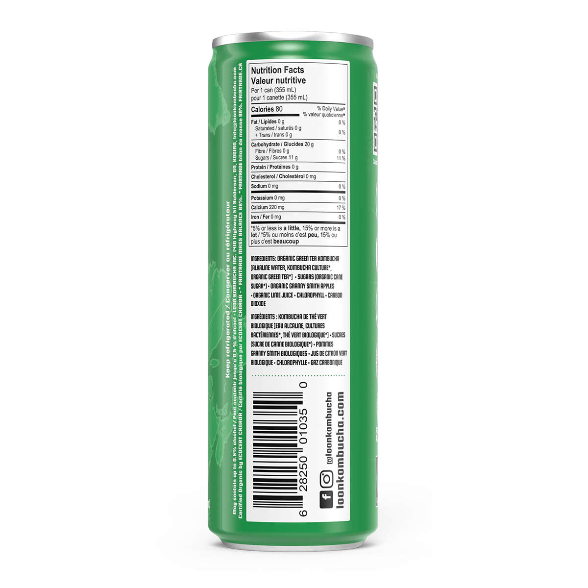 Organic Green Tea Kombucha [Alkaline Water, Kombucha Culture*, Organic Green Tea*] Sugars (Organic Cane Sugar*) Organic Granny Smith Apples, Organic Lime Juice Chlorophyll Carbon Dioxide.