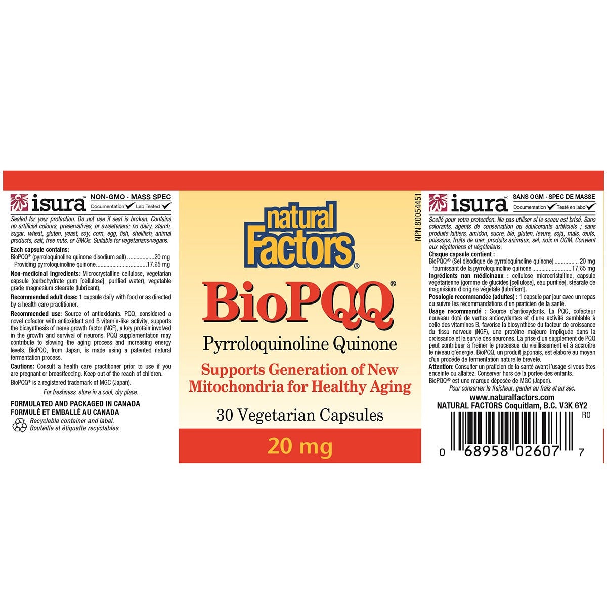 PQQ has antioxidant and B-vitamin-like activity, with a wide range of benefits for the brain and body. It promotes cognitive health and memory by combatting mitochondrial dysfunction and Safeguarding neurons from oxidative damage. It Aids energy metabolism and healthy aging. Natural Factors BioPQQ is created using a natural fermentation process which enhances absorption.