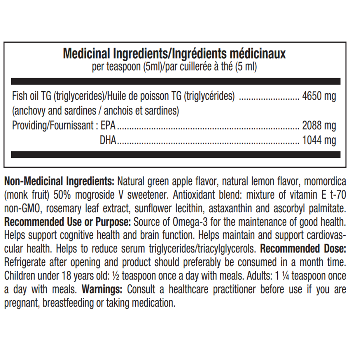 Ultra-concentrated triglyceride form of Omega-3 formula 4650 mg of Omega-3 TG per 5ml (2088 mg EPA, 1044 mg DHA).