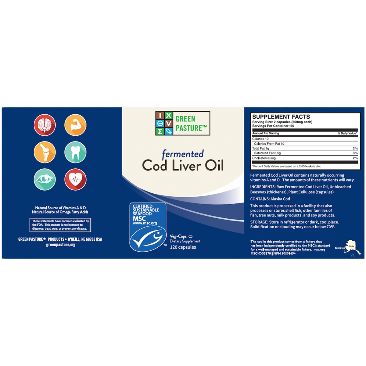 This fermented cod liver oil capsules are perfect for travelers or those who prefer to avoid the taste of liquid cod liver oil. Each capsule delivers the same all-natural nutrients, including vitamins A & D, omega fatty acids, and antioxidants. Crafted with the same care as our liquid version, we use only MSC-certified wild-caught Alaska Cod. Give your health a boost today with these nutrient-packed capsules!