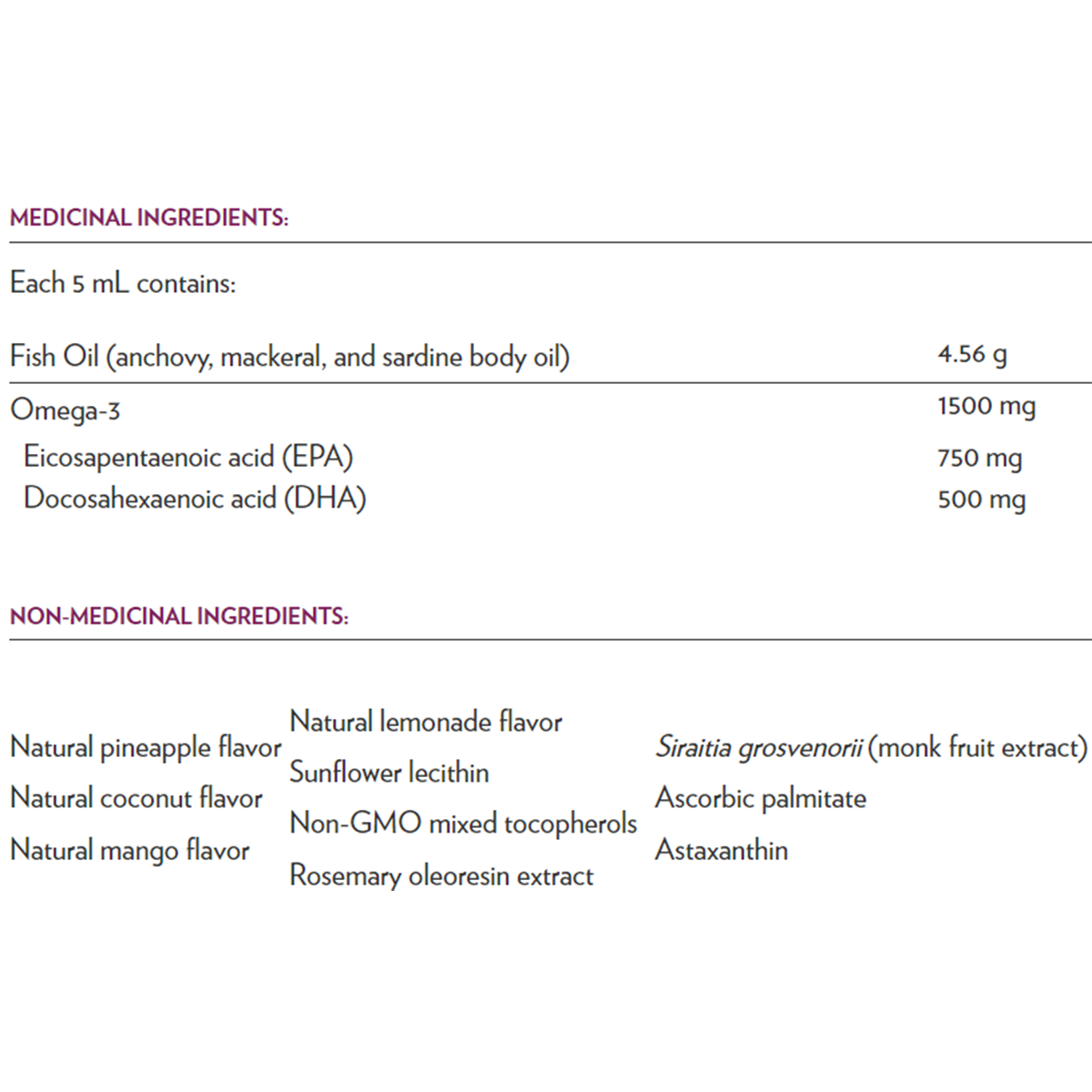 Natural lemonade flavor,Natural pineapple flavor,Sunflower lecithin Natural coconut flavor,Non-GMO mixed tocopherols,Natural mango flavor,Rosemary oleoresin extract,Siraitia grosvenorii (monk fruit extract),Ascorbic palmitate, Astaxanthin.