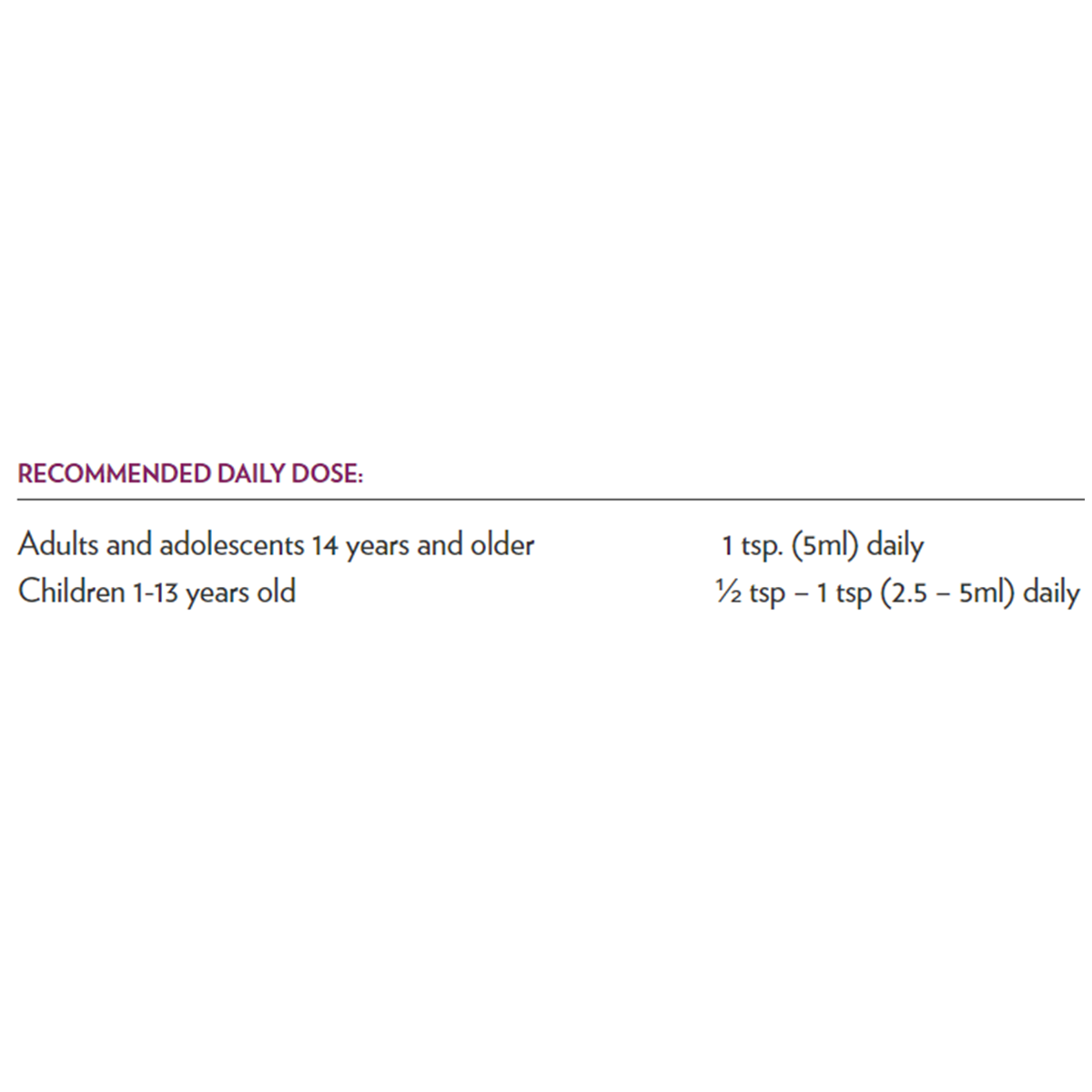 Children 1-13 years old 1 tsp. (5ml) daily ½ tsp - 1 tsp (2.5 - 5ml) daily