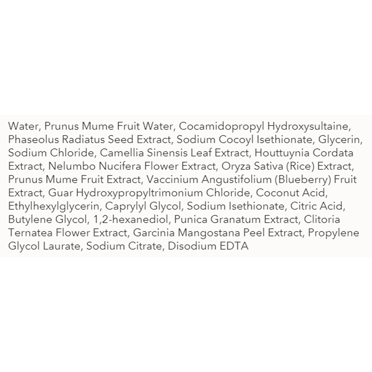 Water, Prunus Mume Fruit Water, Cocamidopropyl Hydroxysultaine, Phaseolus Radiatus Seed Extract, Sodium Cocoyl Isethionate, Glycerin, Sodium Chloride, Camellia Sinensis Leaf Extract, Houttuynia Cordata Extract, Nelumbo Nucifera Flower Extract, Oryza Sativa (Rice) Extract, Prunus Mume Fruit Extract, Vaccinium Angustifolium (Blueberry) Fruit Extract, Guar Hydroxypropyltrimonium Chloride, Coconut Acid, Ethylhexylglycerin, Caprylyl Glycol, Sodium Isethionate, Citric Acid, Butylene Glycol, 1,2-hexanediol, Punica Granatum Extract, Clitoria Ternatea Flower Extract, Garcinia Mangostana Peel Extract, Propylene Glycol Laurate, Sodium Citrate, Disodium EDTA.
