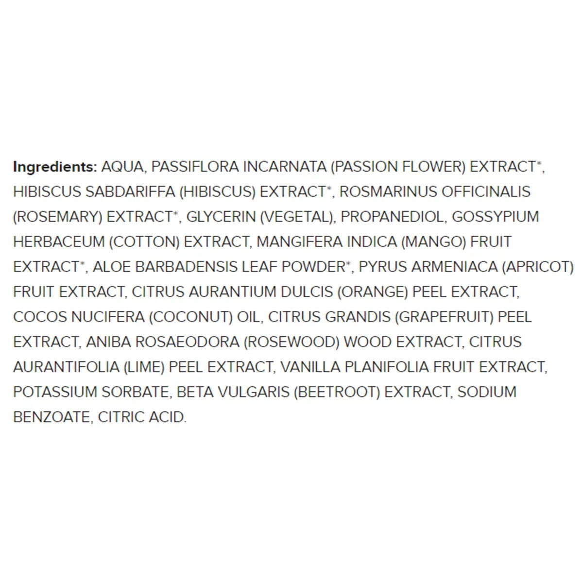 Aqua, Passiflora Incarnata (Passion Flower) Extract*, Hibiscus Sabdariffa (Hibiscus) Extract*, Rosmarinus Officinalis (Rosemary) Extract*, Glycerin (Vegetal), Propanediol, Gossypium Herbaceum (Cotton) Extract, Mangifera Indica (Mango) Fruit Extract*, Aloe Barbadensis Leaf Powder*, Pyrus Armeniaca (Apricot) Fruit Extract, Citrus Aurantium Dulcis (Orange) Peel Extract, Cocos Nucifera (Coconut) Oil, Citrus Grandis (Grapefruit) Peel Extract, Aniba Rosaeodora (Rosewood) Wood Extract, Citrus Aurantifolia (Lime) Peel Extract, Vanilla Planifolia Fruit Extract, Potassium Sorbate, Beta Vulgaris (Beetroot) Extract, Sodium Benzoate, Citric Acid.
