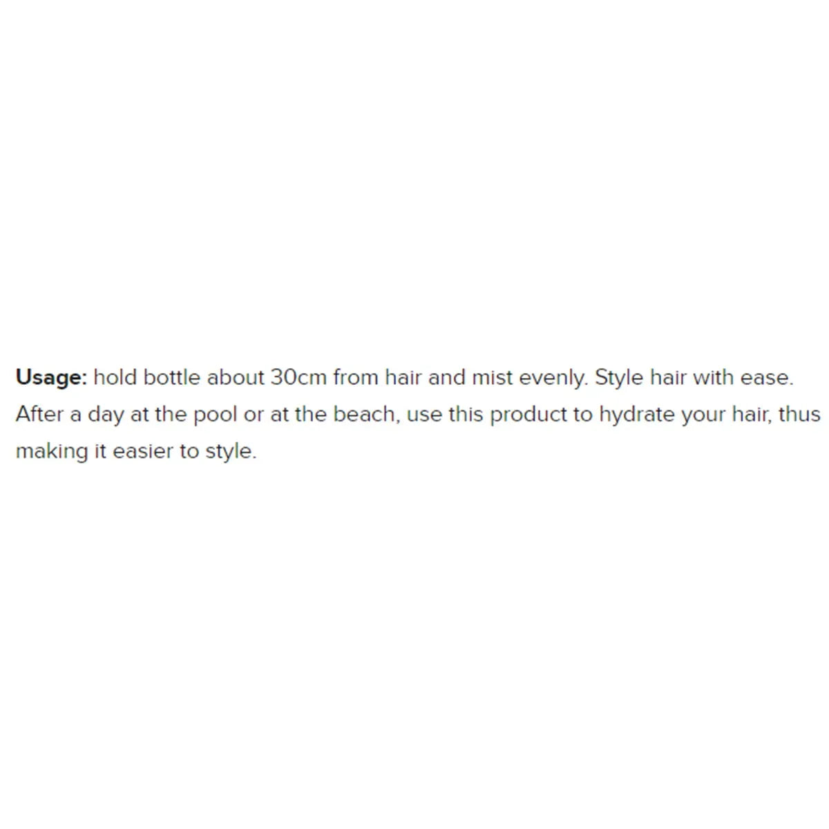 Hold bottle about 30cm from hair and mist evenly. Style hair with ease. After a day at the pool or at the beach, use this product to hydrate your hair, thus making it easier to style.