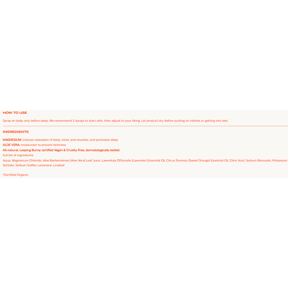 Spray on body only before Restful-Restful-Sleep. We recommend 2 sprays to start with, then adjust to your liking. Let product dry before putting on clothes or getting into bed.