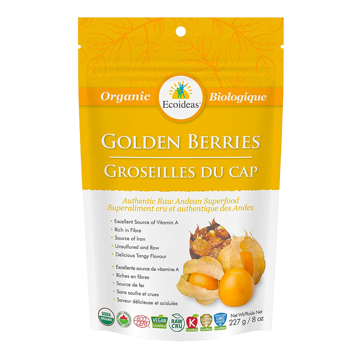 They are an excellent source of vitamin A, which contains the antioxidant beta-carotene. Golden Berries are also a source of iron and are rich in fibre. Snacking on a small handful (¼ cup) provides you with 32% of your daily fibre intake! Ecoideas Golden Berries are raw, and contain no added sugar, sulphur or preservatives.
