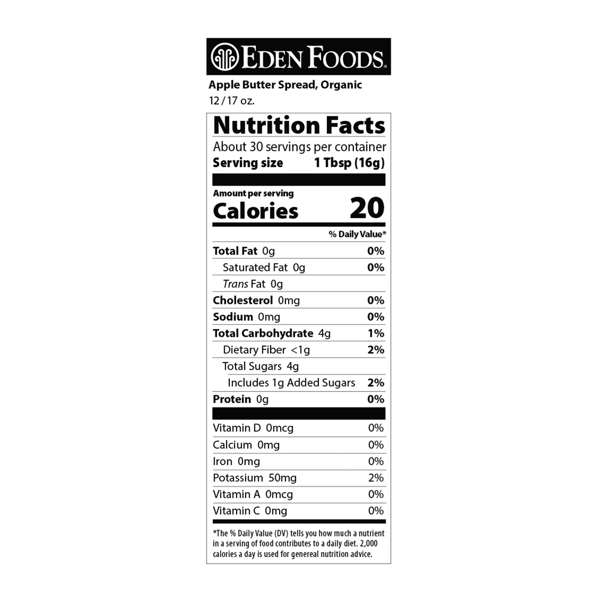 EDEN Organic Apple Butter is a tangy, sweet spread. A jar in your refrigerator makes it easy and fun to eat healthy food. Dollop it on oatmeal and cereal; spread it on toast, pancakes and waffles; use in batter for moist, flavorful baked goods. Use it instead of butter, jam, jelly or frosting. It is fat free and sodium free with no refined sugars.