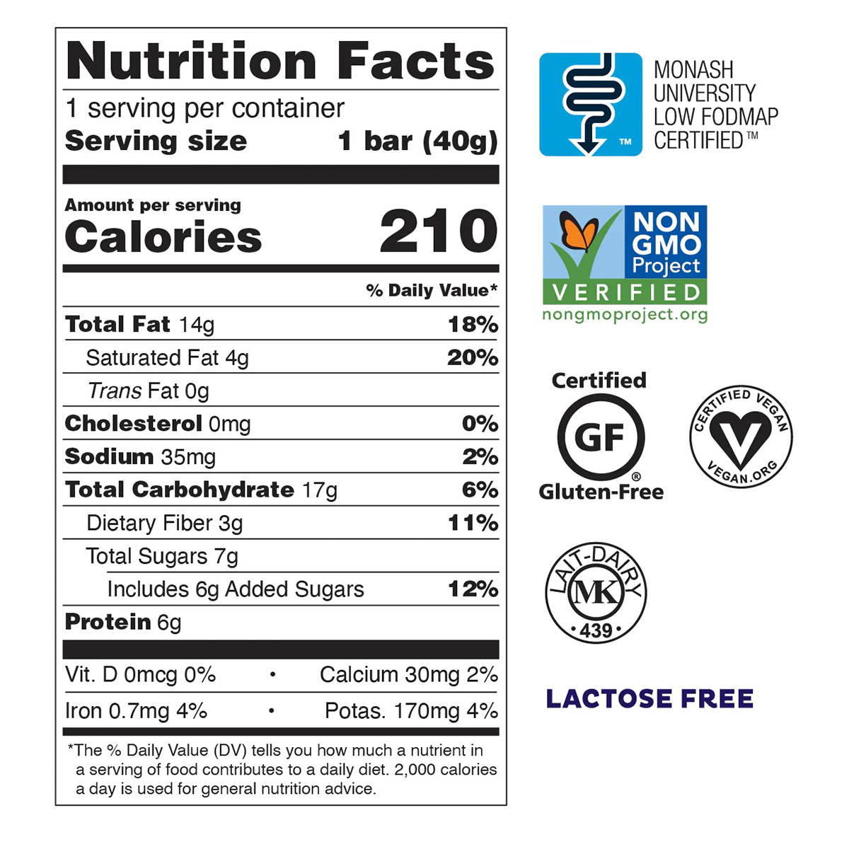 Peanuts, Dry Roasted Almonds, Organic Brown Rice Syrup, Coconut, Organic Maple Syrup Infused with Organic Cinnamon and Organic Vanilla Beans, Glycerin, Organic Brown Rice Crisps (Organic Brown Rice Flour), Walnuts, Sea Salt, Sunflower Lecithin, Sunflower Tocopherols.