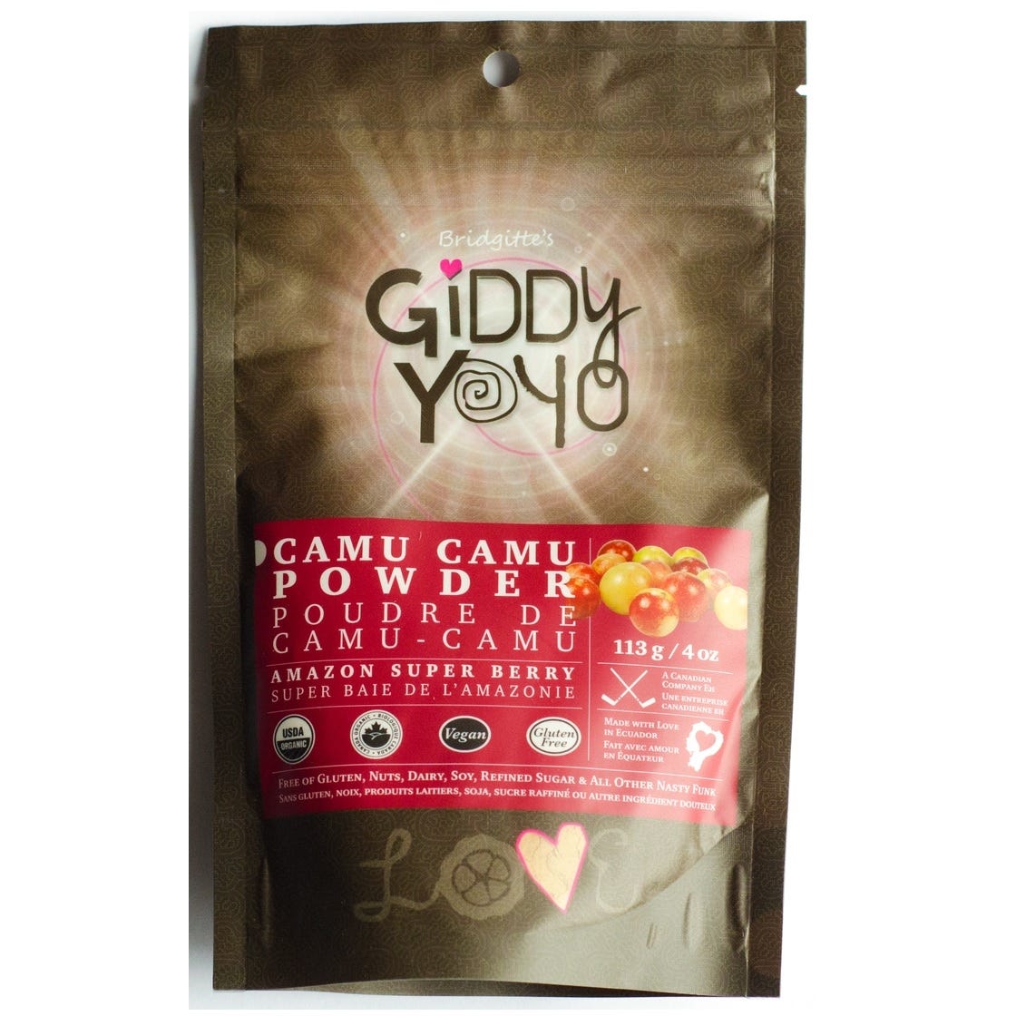 CAMU CAMU is a superfood champion originating from the Amazonian rainforest in Peru. Camu contains a myriad of nutrients and powerful plant compounds, but is best known as one of the most concentrated botanical sources of Vitamin C in the world (2–3% of fresh weight). Camu originates in the mineral rich soil of the Amazonian Rainforest, is organic, vegan, gluten free and low temperature processed. It takes 5.6 kg of fresh fruit (including the skins and seeds) to make 1 kg of Giddy Yo dried camu camu powder. 1.5 tsp. (5g) of Giddy Camu camu contains approximately 880% of the RDI of Vitamin C.