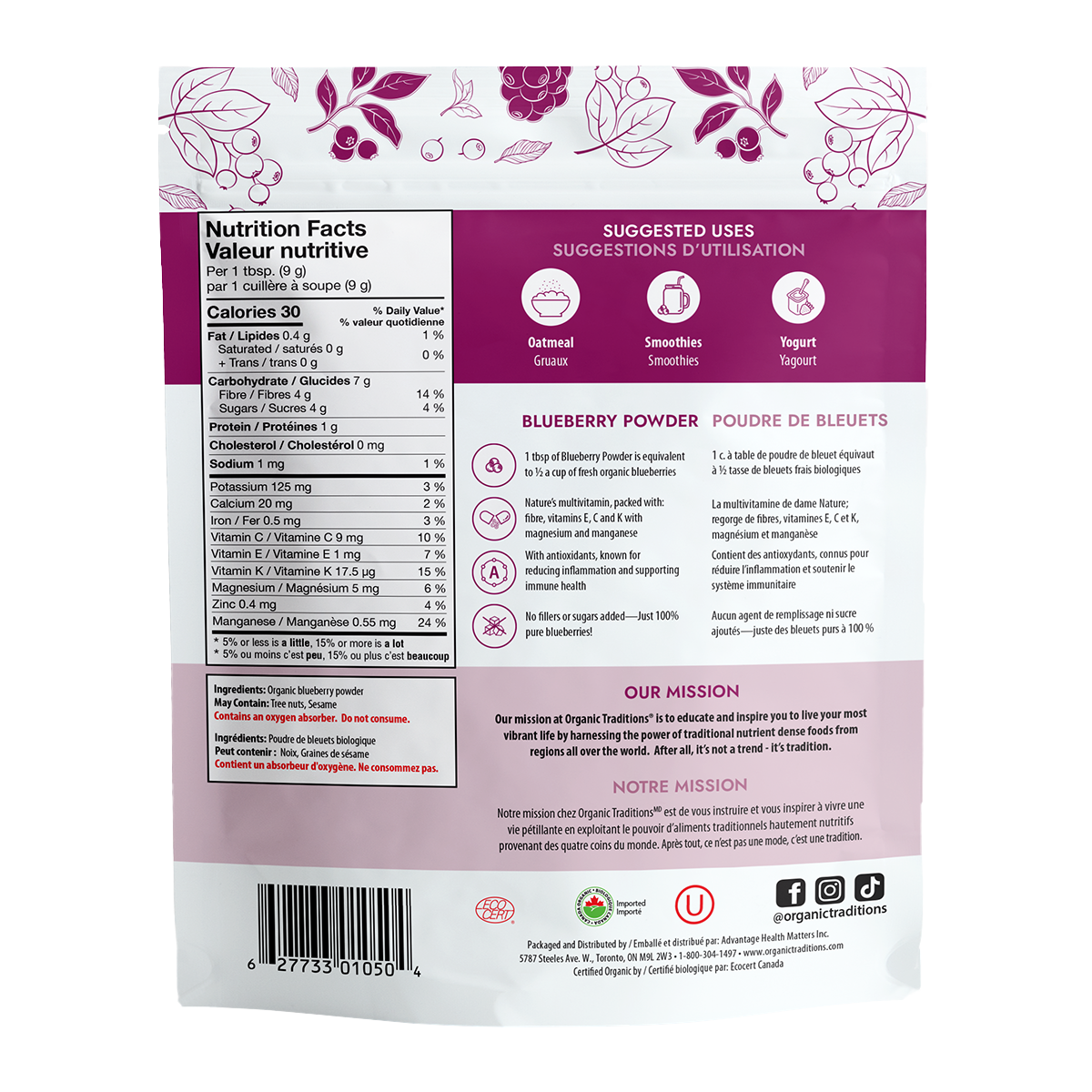 An antioxidant-rich superfruit, this is a great source of vitamin C, manganese, and fiber. One tablespoon of our blueberry powder equals 1/2 cup of fresh blueberries. Produced using a proprietary low-temperature drying process to ensure optimal nutritional integrity. No fillers, flavors, sweeteners, or excipients added.