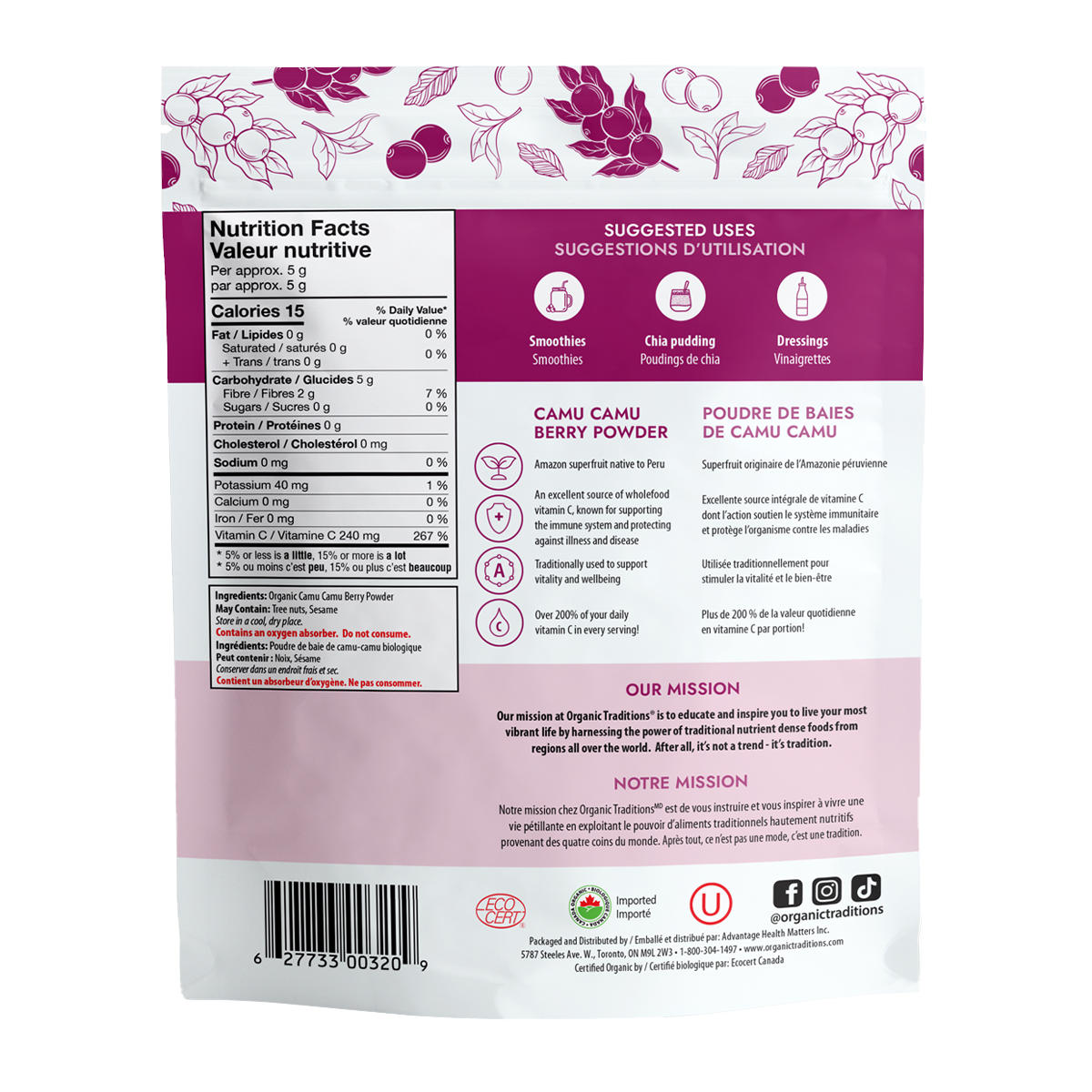 Perfect for smoothies, smoothie bowls, juices, and water. Create a Camu smoothie by blending 1-2 teaspoons of powder of Camu Camu and any other Organic Traditions products of your choice with sufficient water to achieve desired consistency.