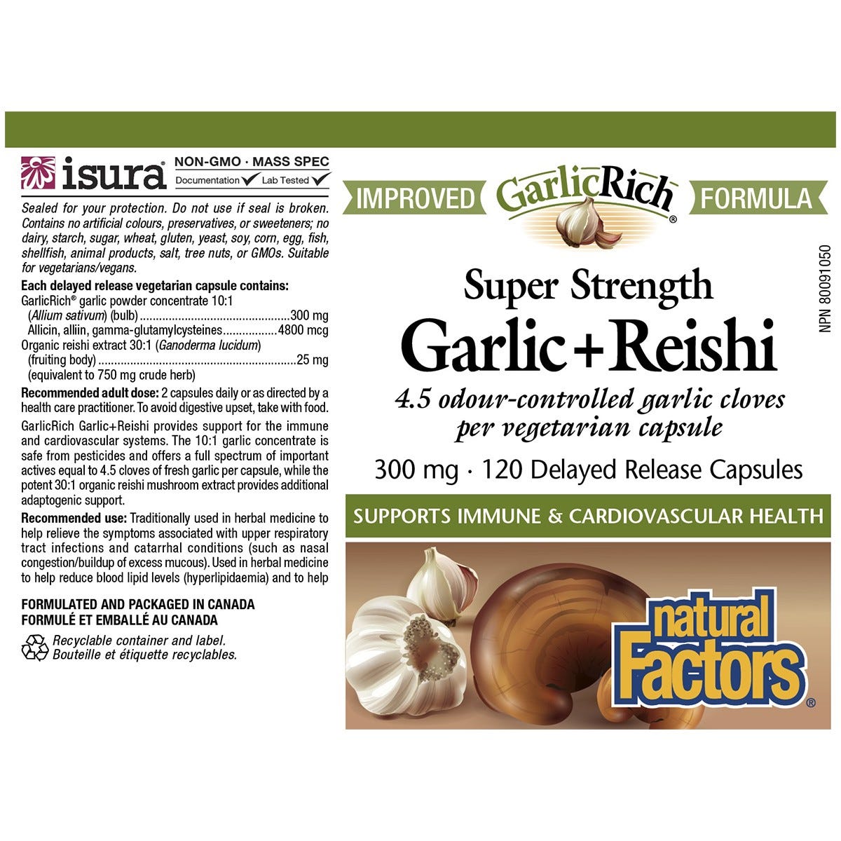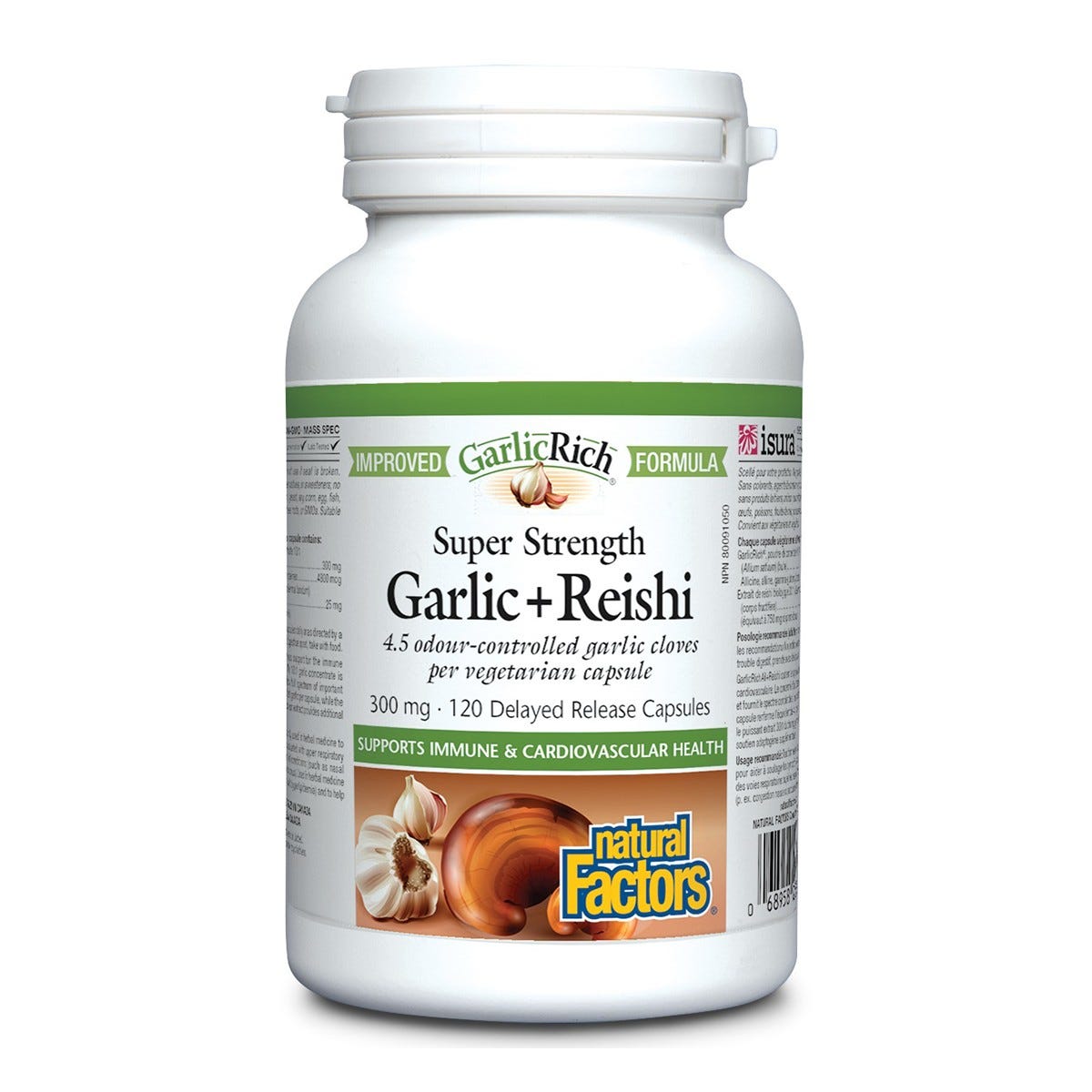 As used in herbal medicine, GarlicRich Super Strength Garlic + Reishi from Natural Factors Aids the immune system and to Assist maintain cardiovascular health courtesy of a 10:1 garlic concentrate and 30:1 organic reishi mushroom extract for adaptogenic Aid. Each capsule provides the full spectrum of active garlic compounds in a delayed-release format to Assist reduce garlic breath.