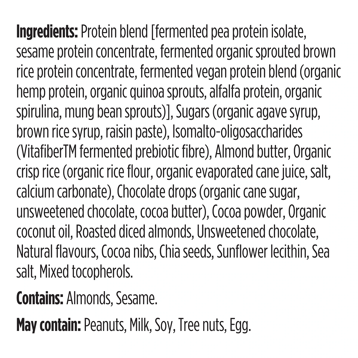 Protein blend [fermented pea protein isolate, sesame protein concentrate, fermented organic sprouted brown rice protein concentrate, fermented vegan protein blend (organic hemp protein, organic quinoa sprouts, alfalfa protein, organic spirulina, mung bean sprouts)], Sugars (organic agave syrup, brown rice syrup, raisin paste), Isomalto-oligosaccharides (VitafiberTM fermented prebiotic fibre), Almond butter, Organic crisp rice (organic rice flour, organic evaporated cane juice, salt, calcium carbonate), Chocolate drops (organic cane sugar, unsweetened chocolate, cocoa butter), Cocoa powder, Organic coconut oil, Roasted diced almonds, Unsweetened chocolate, Natural flavours, Cocoa nibs, Chia seeds, Sunflower lecithin, Sea salt, Mixed tocopherols.