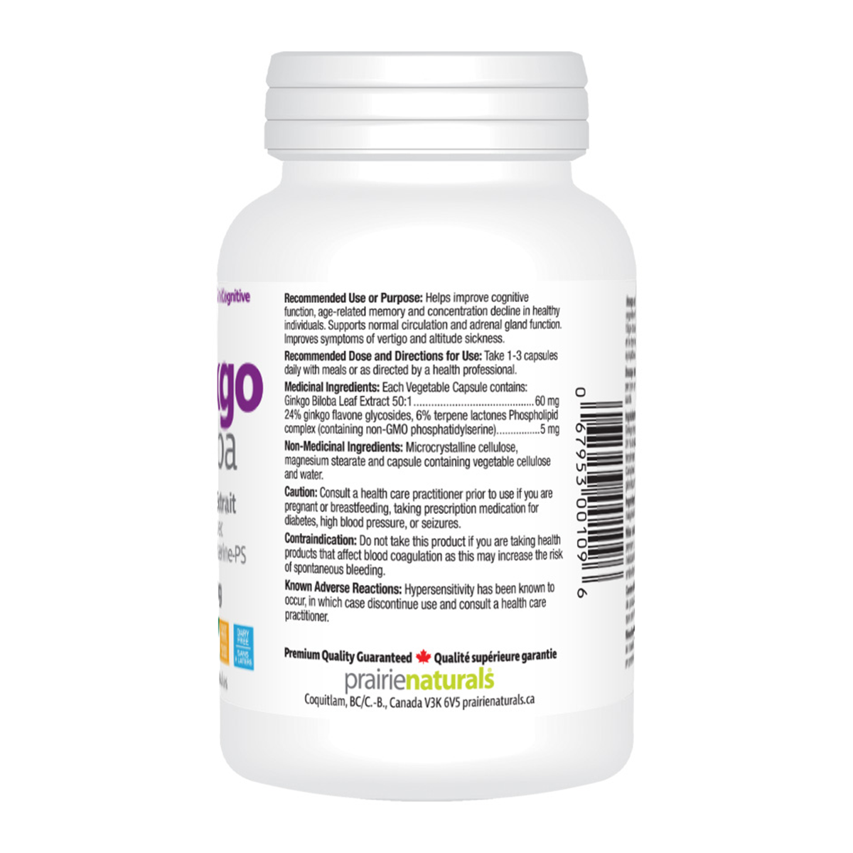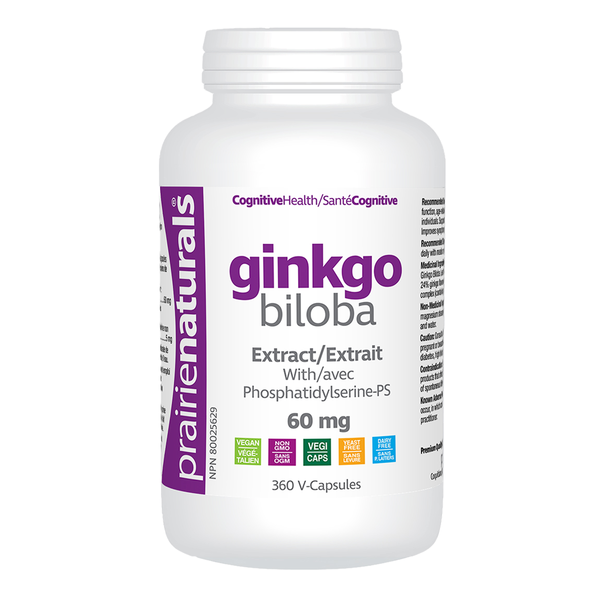 Prairie Naturals Ginkgo Biloba is combined with phosphatidylserine (PS) to maximize the absorption of Ginkgo’s active properties. As an essential component of healthy nerve cell membranes—PS—participates in key signaling pathways in the neuronal system , which Assist keep your memory sharp and improve cognitive capacity as you get older.