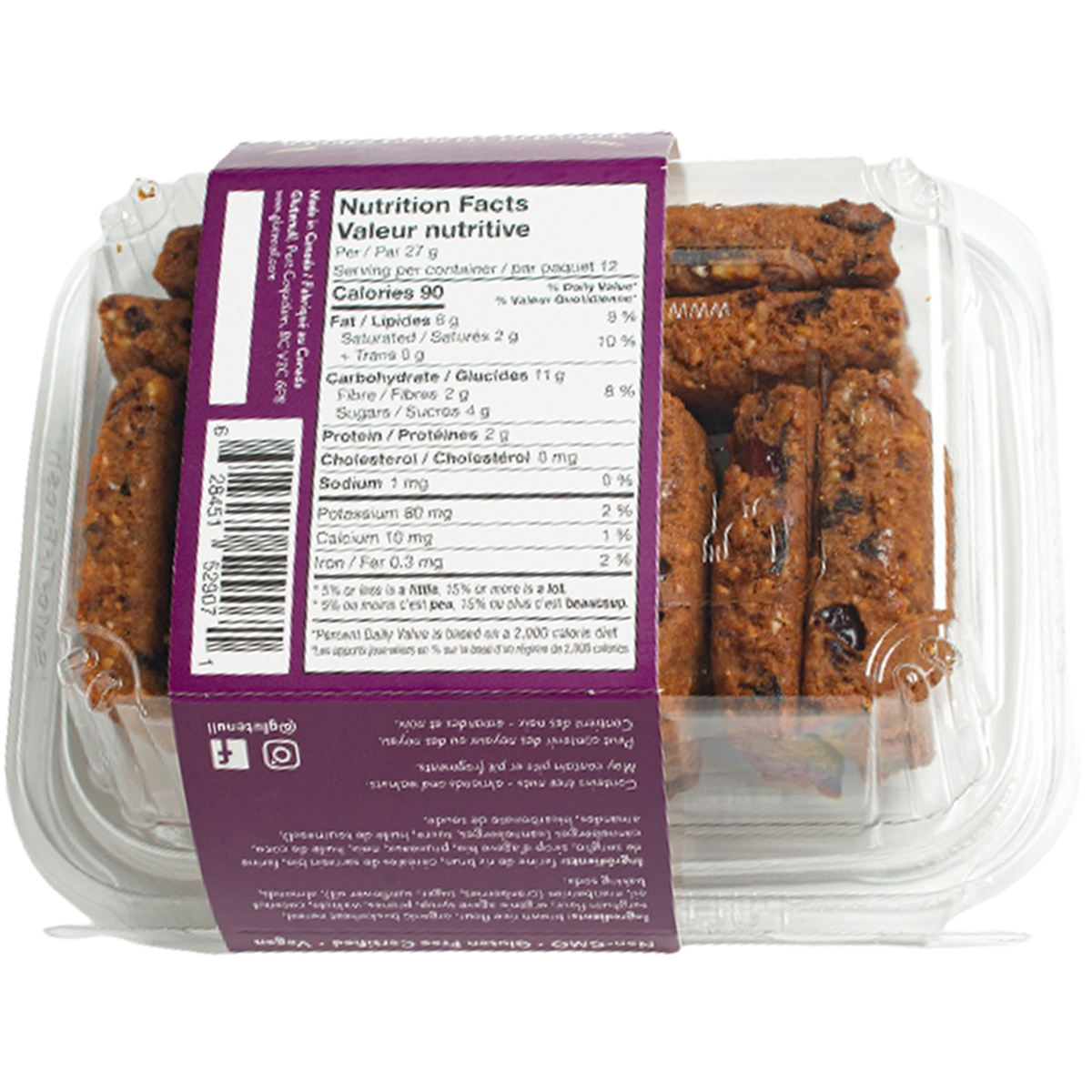 Brown rice flour, organic buckwheat cereal, sorghum flour, organic agave syrup, prunes, walnuts, coconut oil, cranberries, almonds, baking soda.