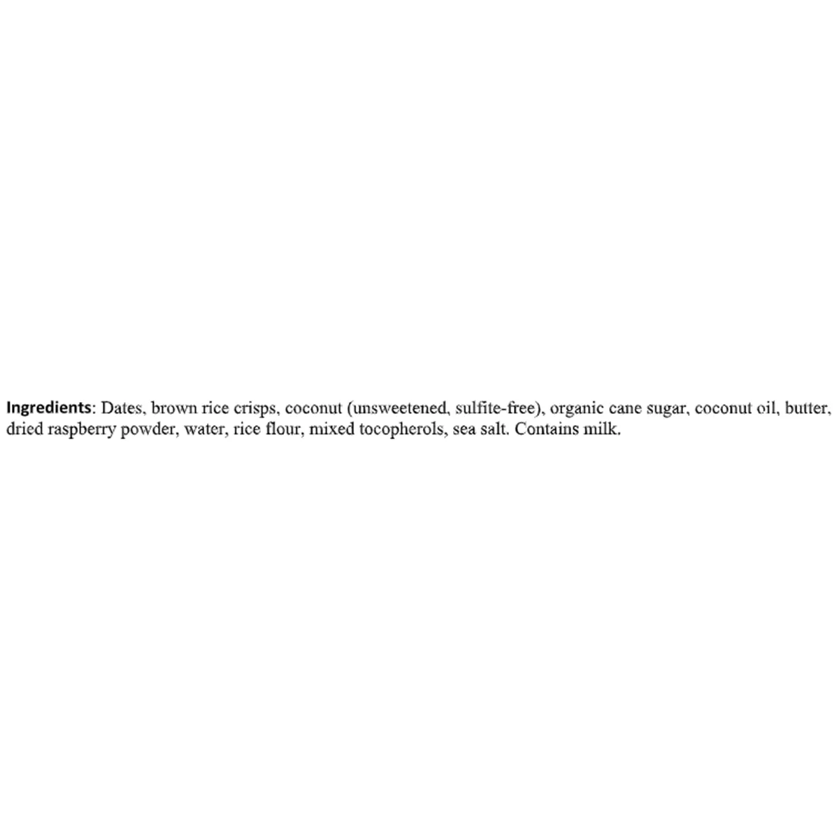 Dates, brown rice crisps, coconut (unsweetened, sulfite-free), organic cane sugar, coconut oil, butter, dried raspberry powder, water, rice flour, mixed tocopherols, sea salt.
