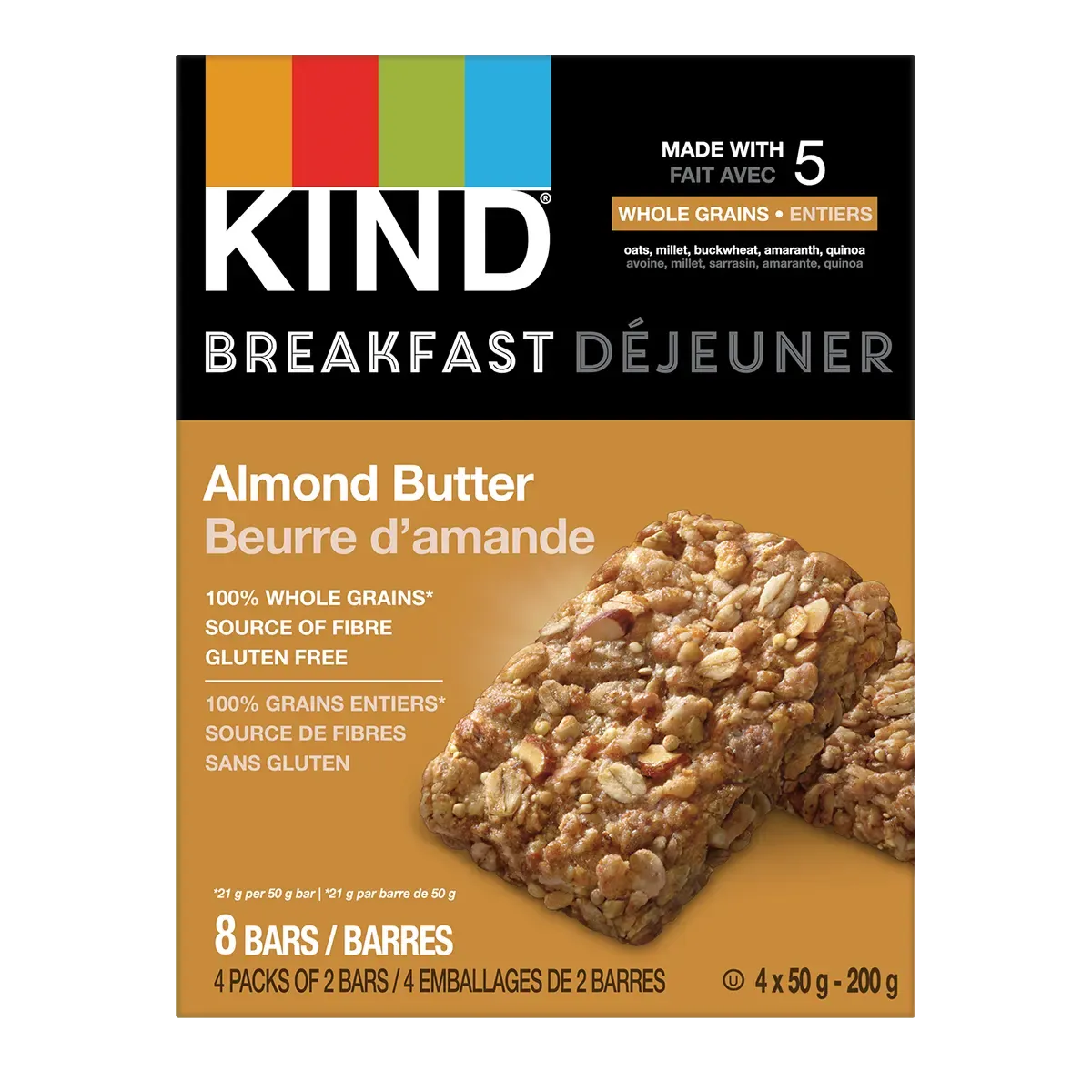 A wholesome, healthy snack made with 100% whole grains for sustained energy. KIND Almond Butter breakfast protein bars are made with five super grains—oats, buckwheat, millet, amaranth and quinoa—and baked with almonds and a touch of honey for a chewy, soft baked addition to your breakfast.