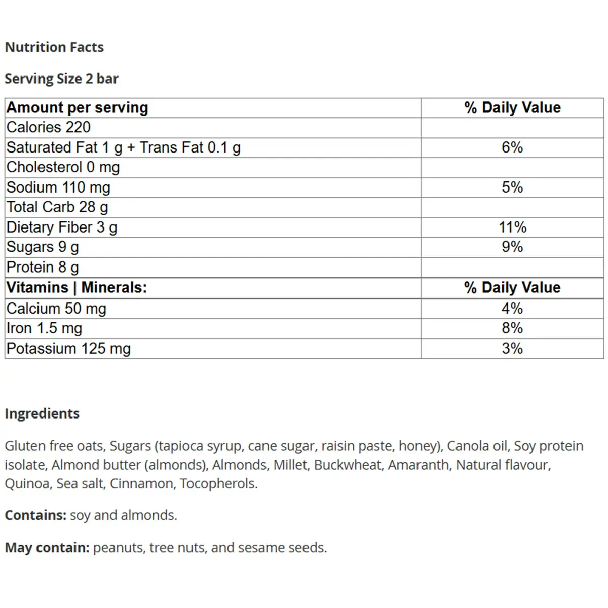 Gluten free oats, Sugars (tapioca syrup, cane sugar, raisin paste, honey), Canola oil, Soy protein isolate, Almond butter (almonds), Almonds, Millet, Buckwheat, Amaranth, Natural flavour, Quinoa, Sea salt, Cinnamon, Tocopherols.