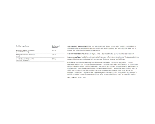 Gelatin, rice bran oil, glycerin, enteric coating (ethyl cellulose, sodium alginate, ammonium hydroxide, medium-chain triglycerides, oleic acid, and stearic acid [veg.]), purified water, silicon dioxide, and chlorophyllin copper complex sodium.