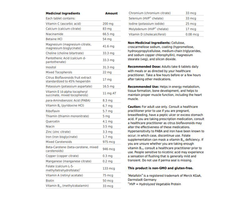 For adult use only. Consult a healthcare practitioner prior to use if you are pregnant, breastfeeding, have a peptic ulcer or excess stomach acid. If you are taking prescription medication, consult a healthcare practitioner as citrus bioflavonoids may alter the effectiveness of these Health Products. Hypersensitivity to PABA and iron have been known to occur; in which case, discontinue use. Folate supplementation can mask a vitamin B12 deficiency. If you are unsure whether you are taking enough vitamin B12, consult a healthcare practitioner prior to use. People sensitive to nicotinic acid may experience a sensation of flushing that is generally mild and transient. Do not use if perma seal is missing.
