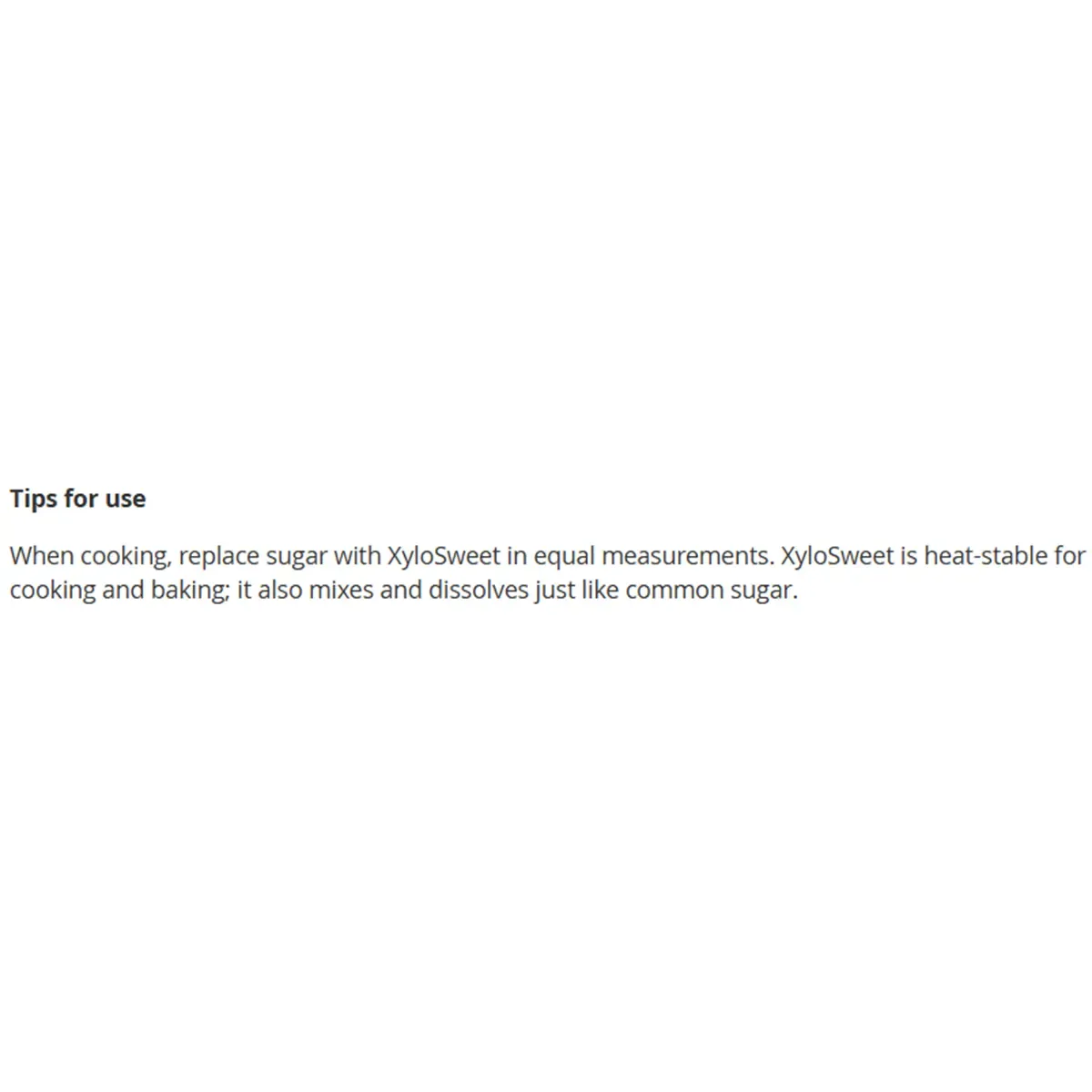 When cooking, replace sugar with XyloSweet in equal measurements. XyloSweet is heat-stable for cooking and baking; it also mixes and dissolves just like common sugar.