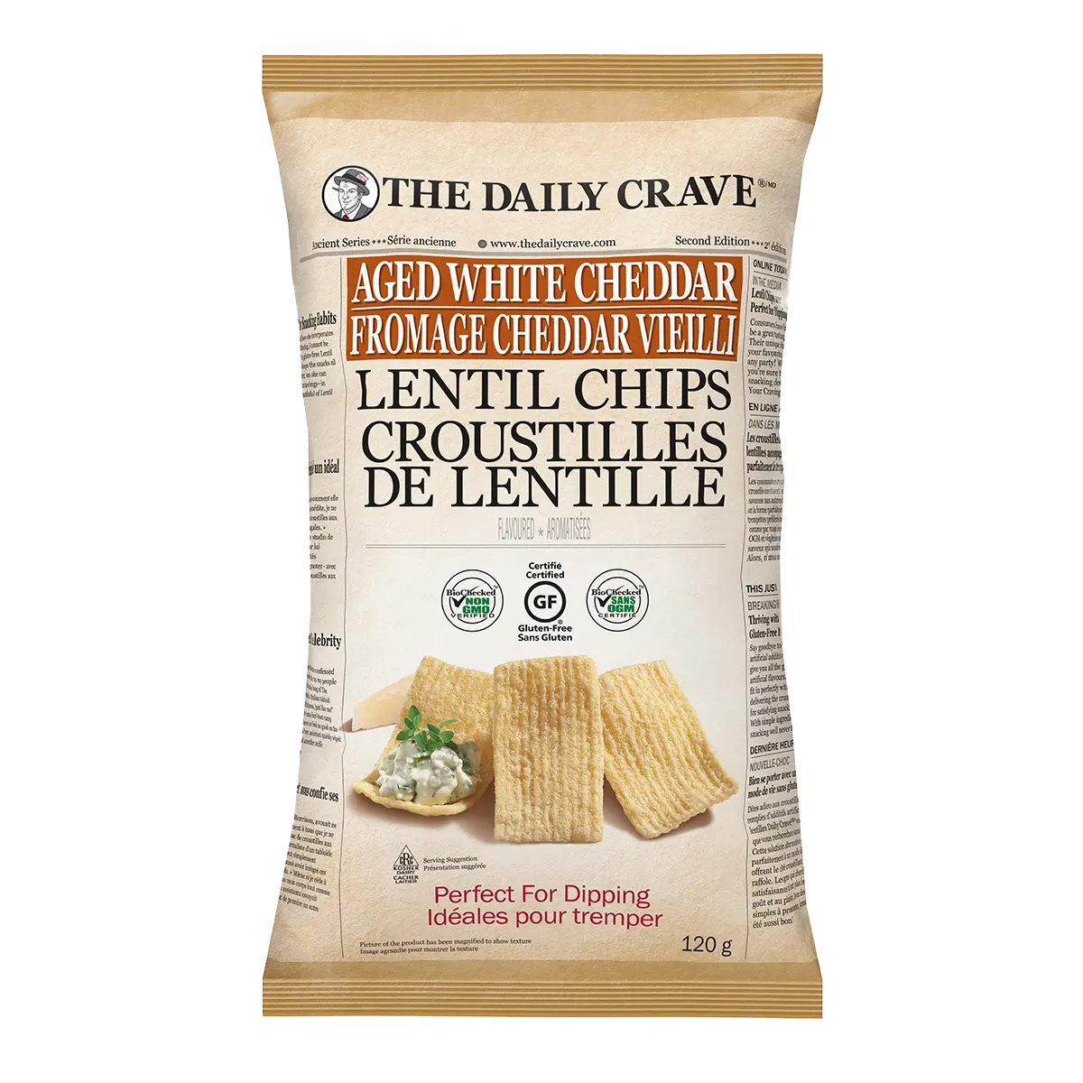 The Daily Crave Aged White Cheddar Lentil Chips offer a crunchy, all-natural snack packed with plant protein. Seasoned with white cheddar cheese and natural spices, this healthy, plant-based option is perfect for satisfying your chip cravings.