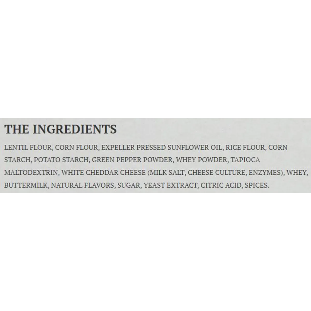 Lentil Flour, Corn Flour, Expeller Pressed Sunflower Oil, Rice Flour, Corn Starch, Potato Starch, Green Pepper Powder, Whey Powder, Tapioca Maltodextrin, White Cheddar Cheese (Milk Salt, Cheese Culture, Enzymes), Whey, Buttermilk, Natural Flavors, Sugar, Yeast Extract, Citric Acid, Spices.