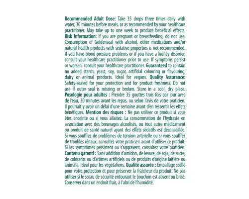 Risk Information: If you are pregnant or breastfeeding, do not use. Consumption of Goldenseal with alcohol, other Health Products and/or natural health products with sedative properties is not recommended. If you have blood pressure problems or if you have a kidney disorder, consult your healthcare practitioner prior to use. If symptoms persist or worsen, consult your healthcare practitioner.