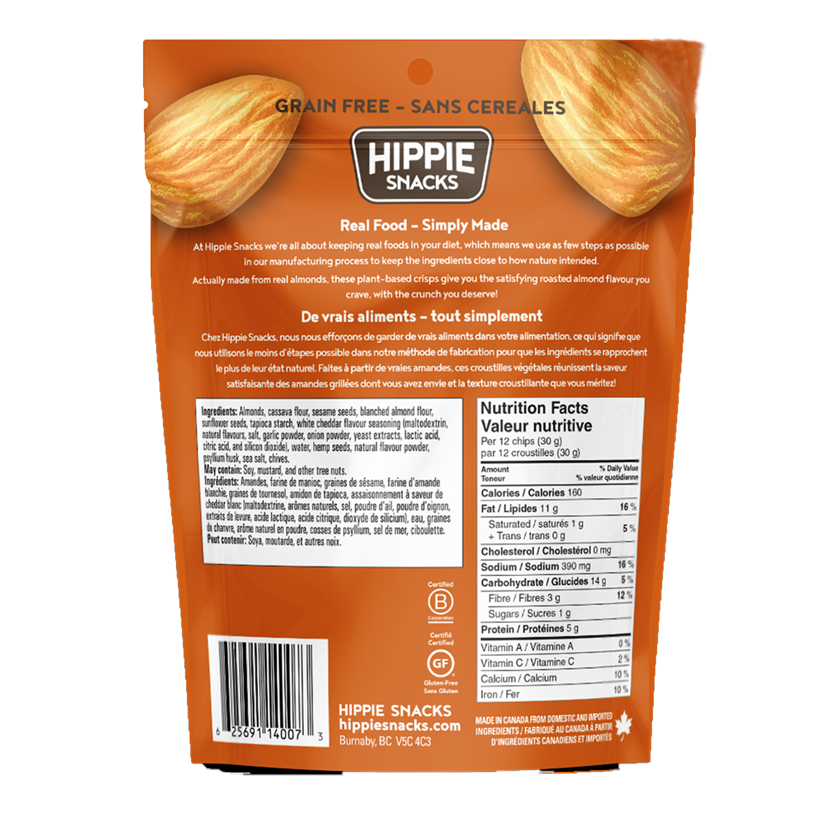 Almonds, cassava flour, sesame seeds, blanched almond flour, sunflower seeds, tapioca starch, white cheddar flavour seasoning (maltodextrin, natural flavours, salt, garlic powder, onion powder, yeast extracts, lactic acid, citric acid, and silicon dioxide), water, hemp seeds, natural flavour powder, psyllium husk, sea salt, chives.