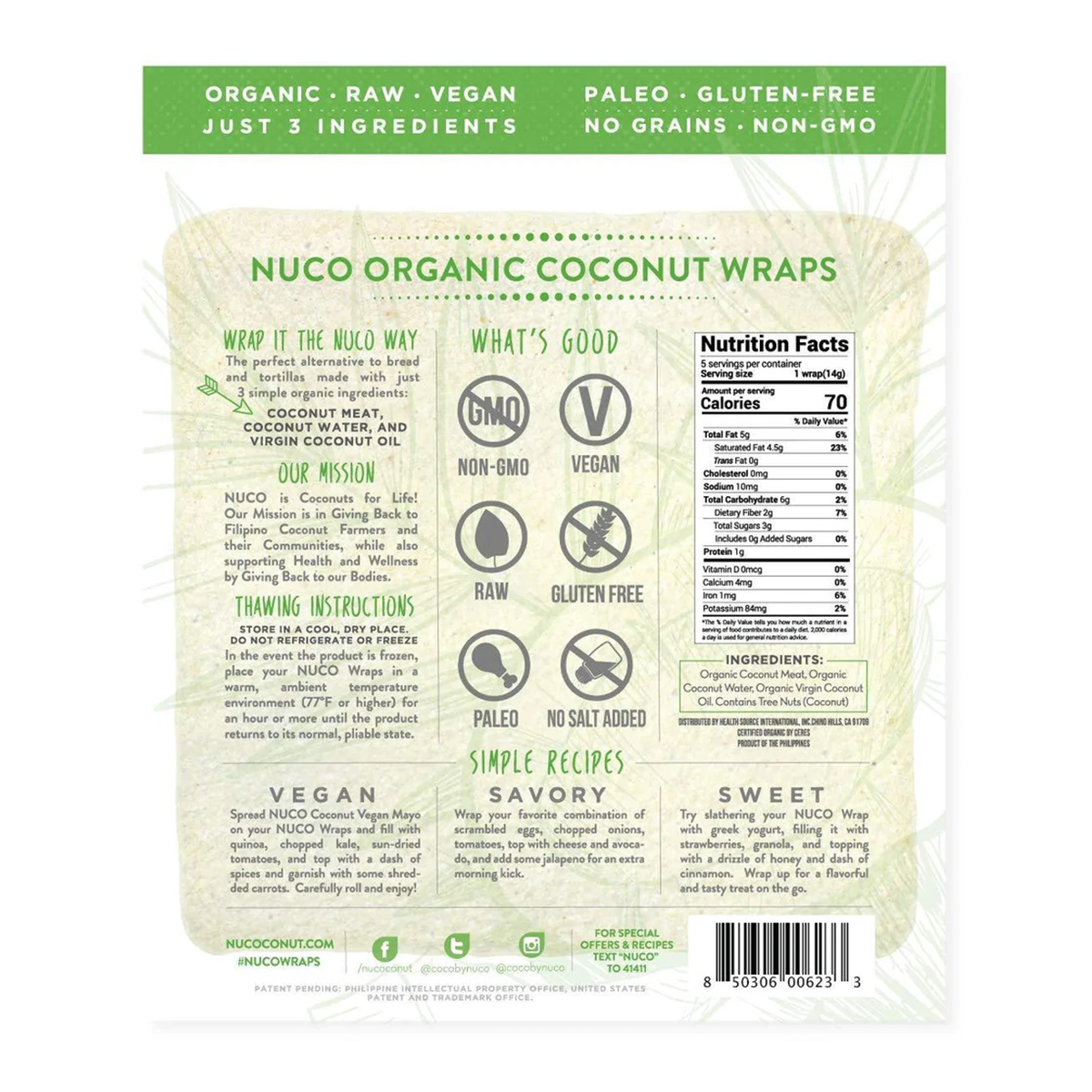 It's just 3 simple organic ingredients: coconut meat, coconut water, and unrefined virgin coconut oil. The Wrap is pliable/foldable and can be used in many applications and recipes! Available in 4 unique flavours!