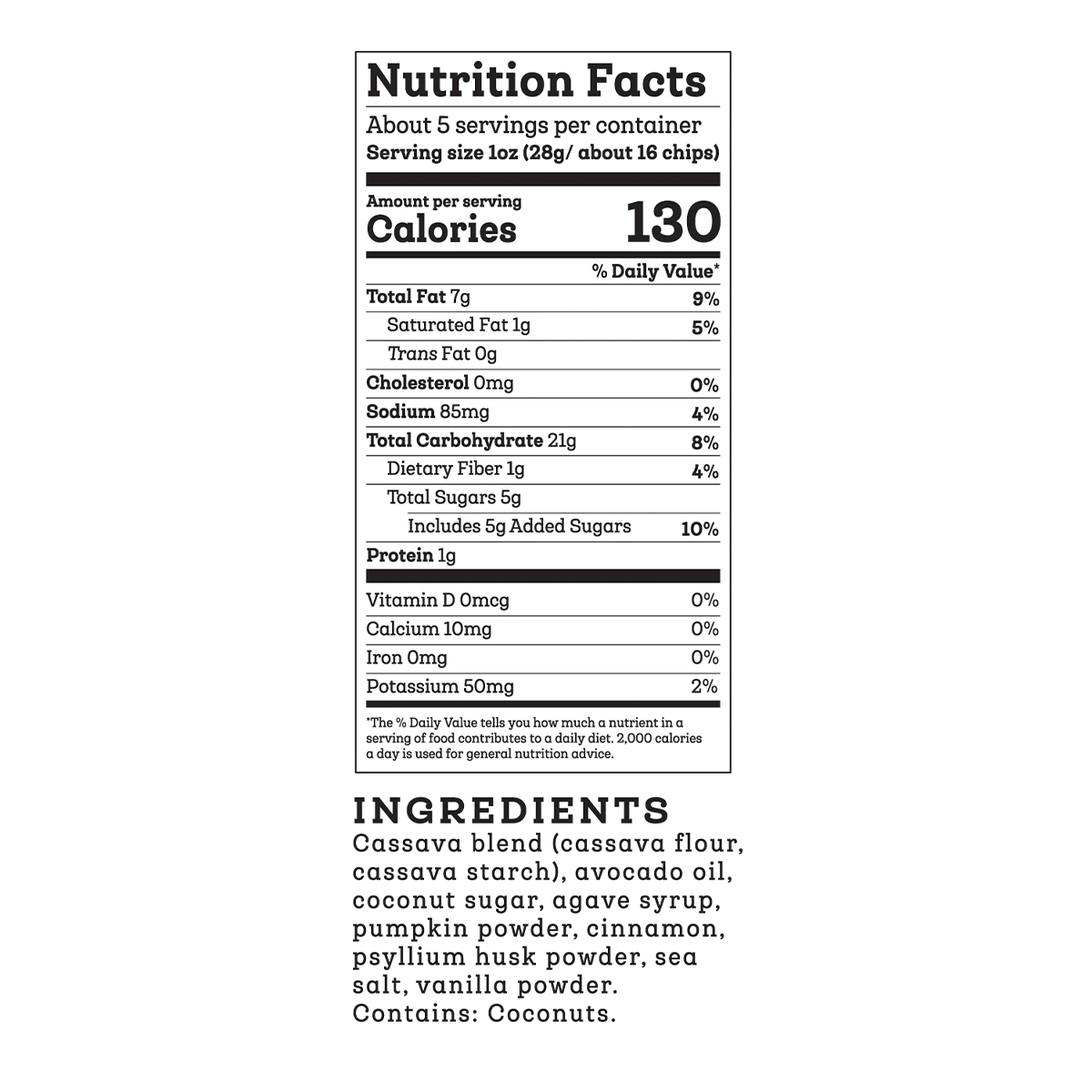 Cassava blend (cassava flour, cassava starch), avocado oil, coconut sugar, agave syrup, pumpkin powder, cinnamon, psyllium husk powder, sea salt, vanilla powder.
