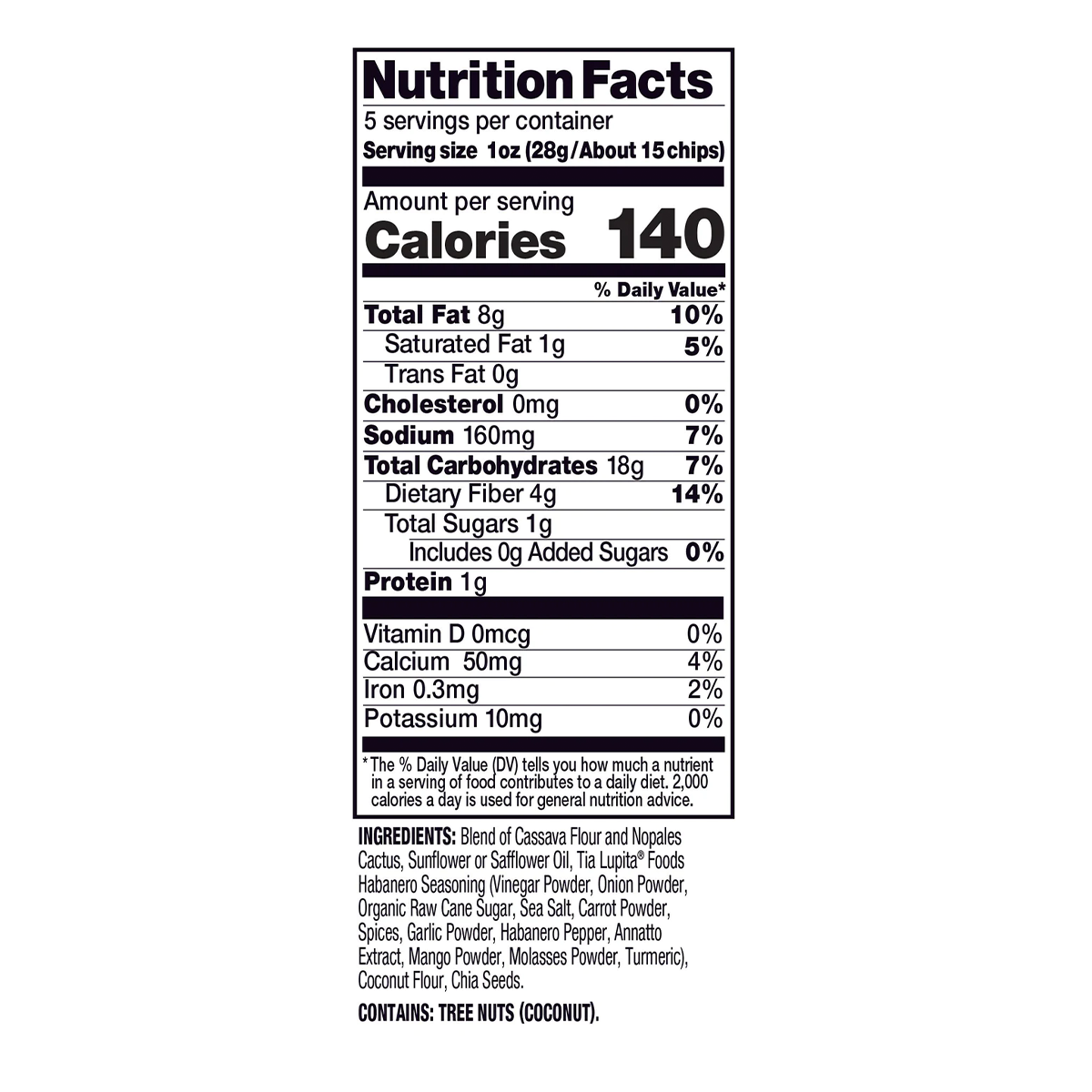 Blend of Cassava Flour and Nopales Cactus, Sunflower or Safflower Oil, Tia Lupita Foods Habanero Seasoning (Vinegar Powder, Onion Powder, Organic Raw Cane Sugar, Sea Salt, Carrot Powder, Spices, Garlic Powder, Habanero Pepper, Annatto Extract, Mango Powder, Molasses Powder, Turmeric), Coconut Flour, Chia Seeds.