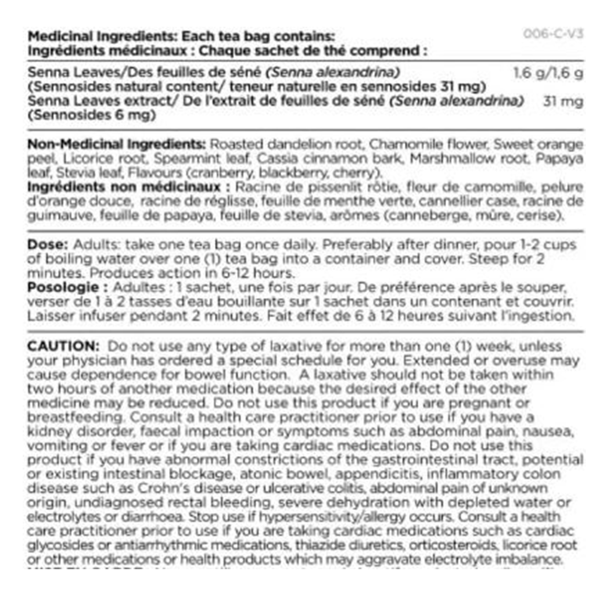 Adults: take 2 tea bags once daily. Preferably after dinner, pour 1-2 cups of boiling water over 2 tea bags into a container and cover. Steep for 2 minutes. Produces action in 6-12 hours.