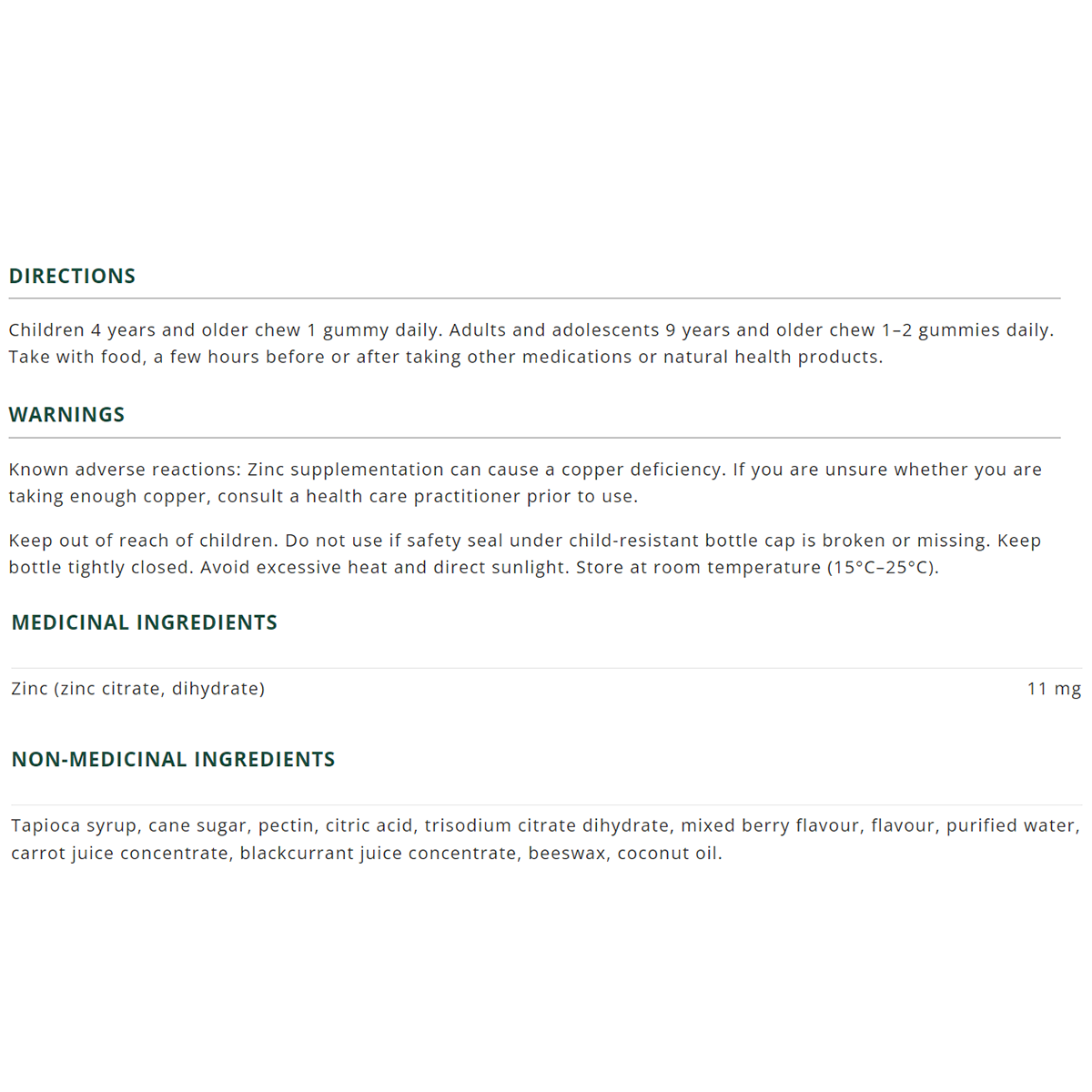 Children 4 years and older chew 1 gummy daily. Adults and adolescents 9 years and older chew 1–2 gummies daily. Take with food, a few hours before or after taking other Health Products or natural health products.
