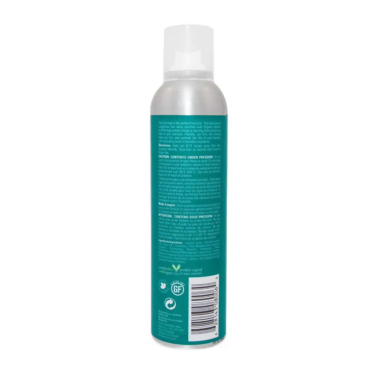 The final step to the perfect hairstyle. This salon-quality, weightless hair spray enriched with organic bamboo and moringa extract delivers dazzling shine and all-day hold. Flexible yet firm, this formula locks out frizz, extends the life of your hairstyle, and provides built-in humidity resistance.