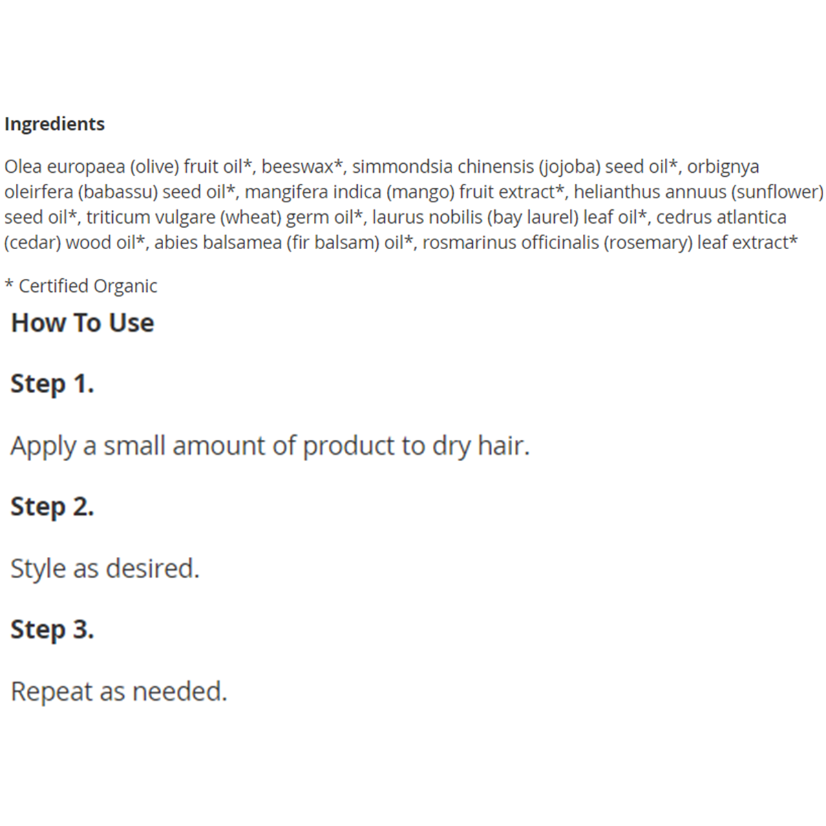 Olea europaea (olive) fruit oil*, beeswax*, simmondsia chinensis (jojoba) seed oil*, orbignya oleirfera (babassu) seed oil*, mangifera indica (mango) fruit extract*, helianthus annuus (sunflower) seed oil*, triticum vulgare (wheat) germ oil*, laurus nobilis (bay laurel) leaf oil*, cedrus atlantica (cedar) wood oil*, abies balsamea (fir balsam) oil*, rosmarinus officinalis (rosemary) leaf extract*