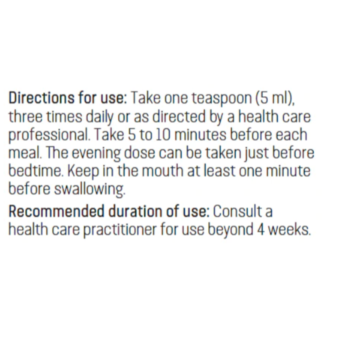 Take one teaspoon (5 ml), three times daily or as directed by a health Wellness-Care professional. Take 5 to 10 minutes before each meal. The evening dose can be taken just before bedtime. Keep in the mouth at least one minute before swallowing.