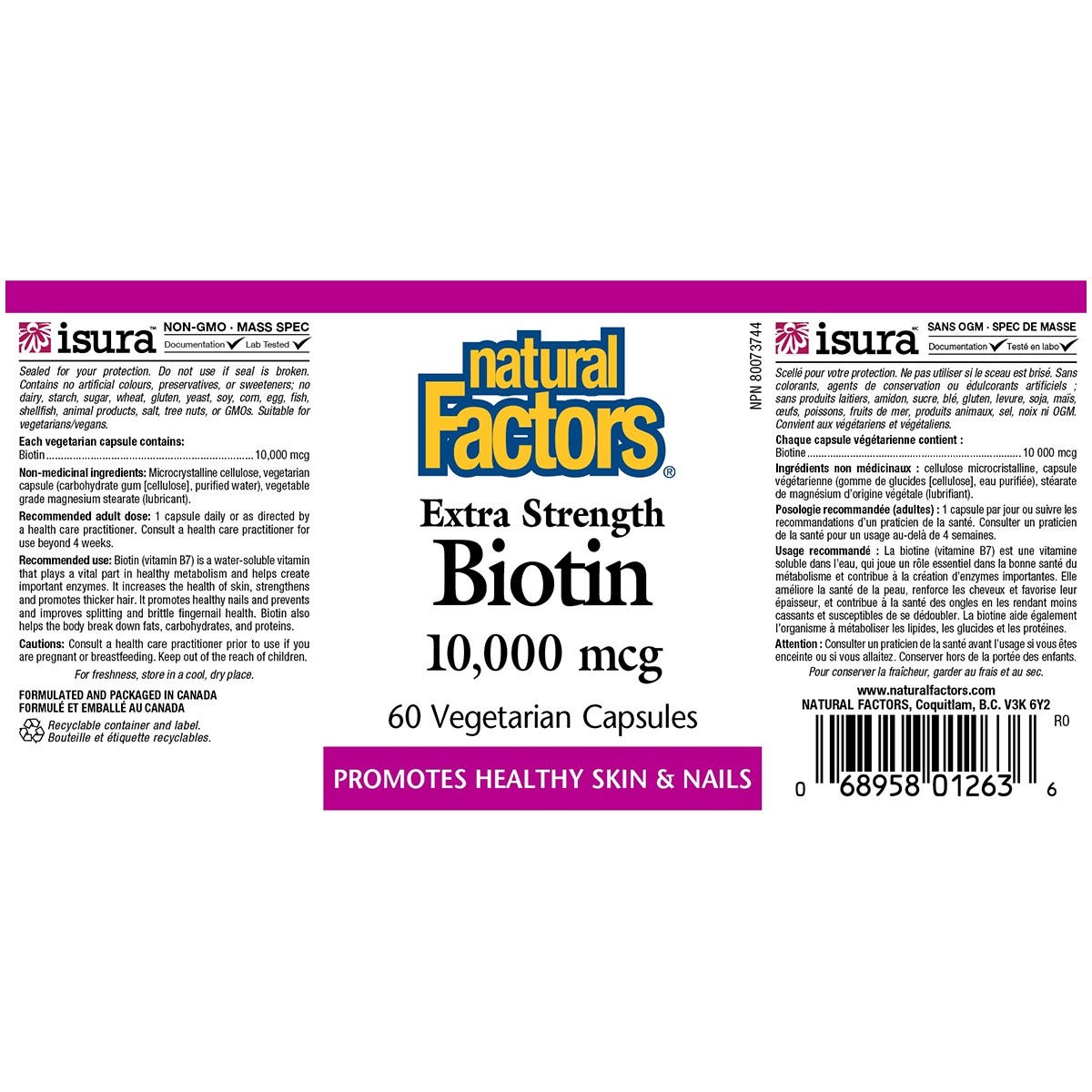Natural Factors Biotin 10,000 mcg is a one-a-day vegetarian-friendly supplement that promotes healthy nails as well as prevents and improves splitting and brittle fingernail health. Biotin 10,000 mcg also increases the health of skin, strengthens and promotes thicker hair. This essential B vitamin helps the body metabolize carbohydrates, fats, and proteins for the maintenance of good health. Biotin is also available in 1000 mcg and 5000 mcg vegetarian capsules.