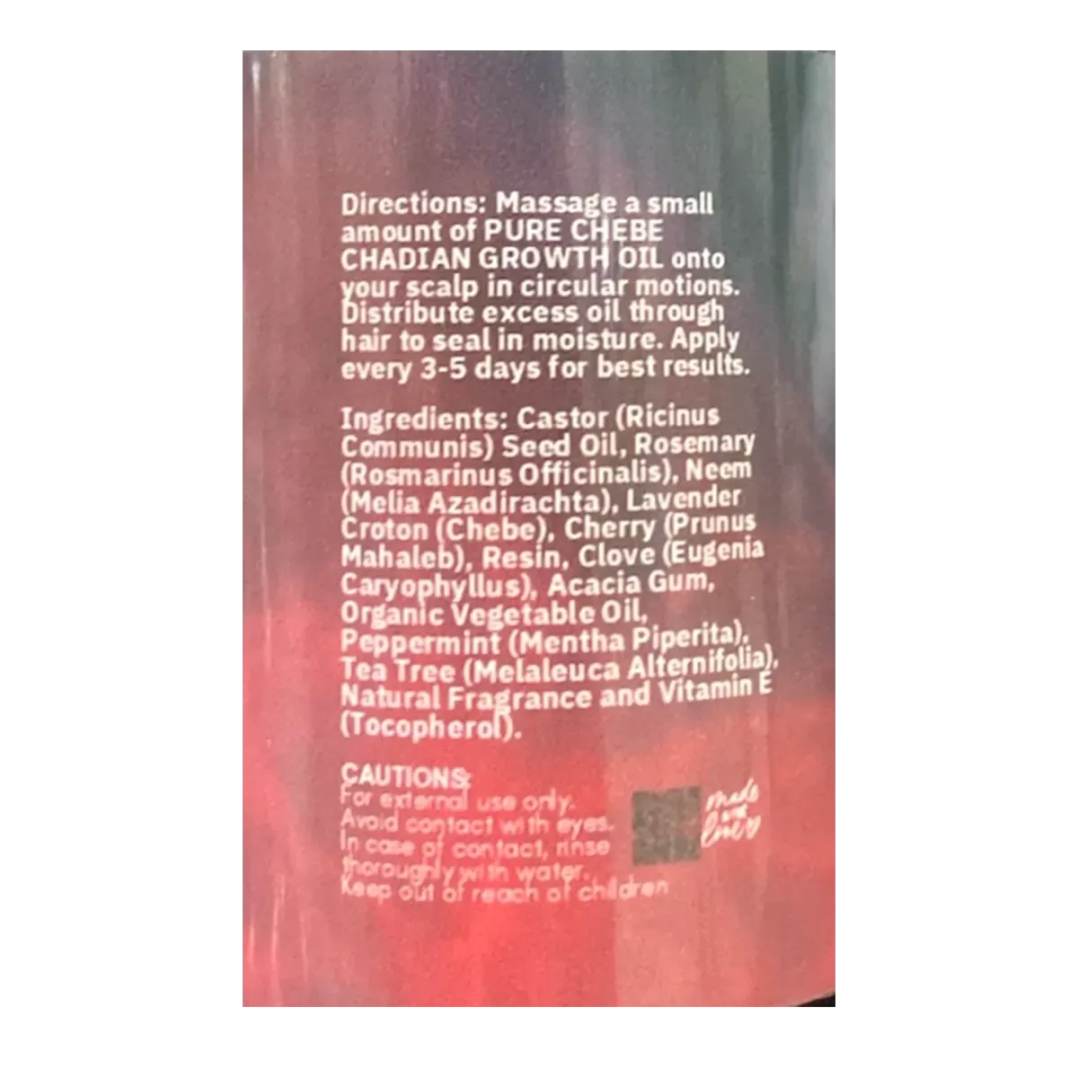Massage a small amount of PURE CHEBE CHADIAN GROWTH OIL onto your scalp in circular motions. Distribute excess oil through hair to seal in moisture. Apply every 3-5 days for best results.