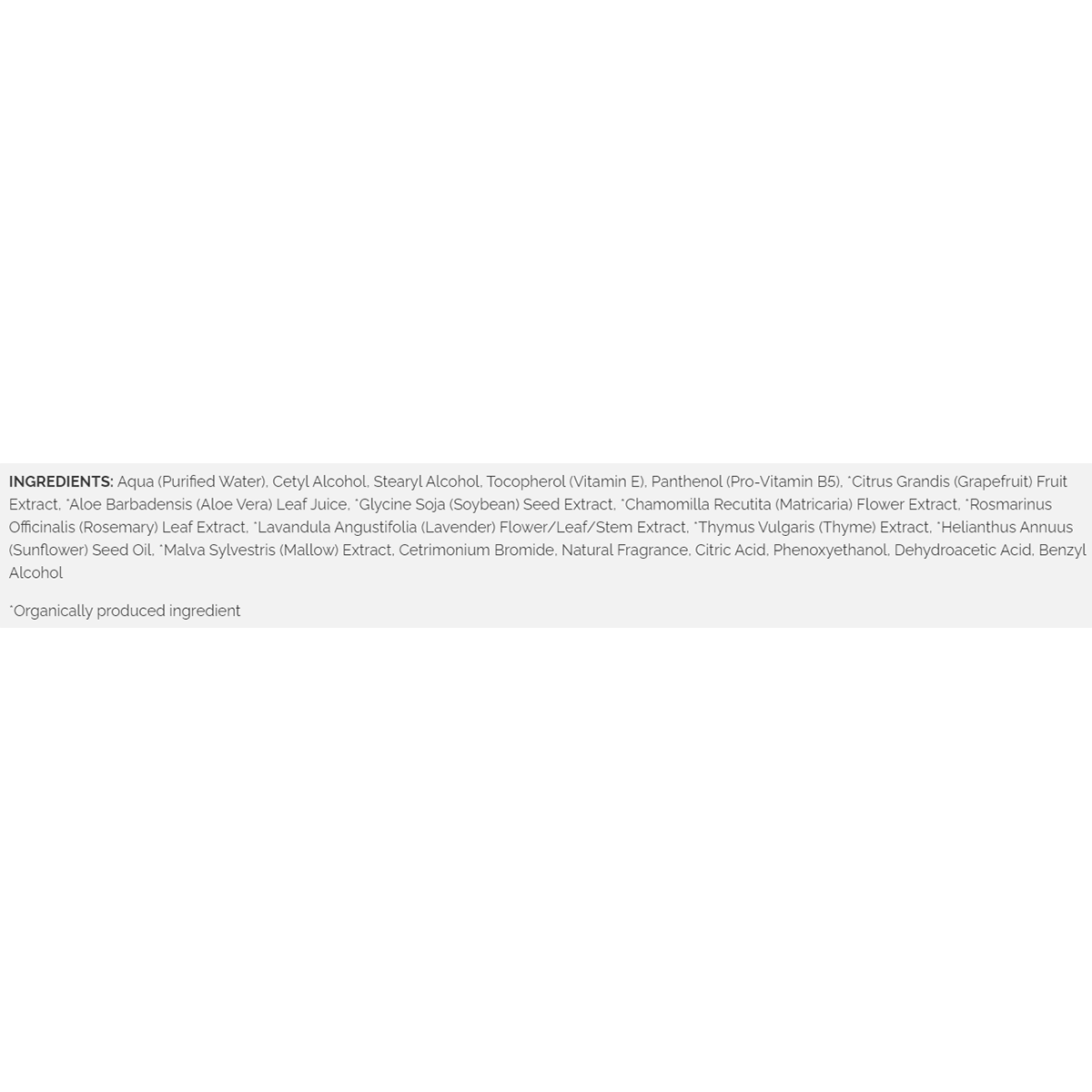 Aqua (Purified Water), Cetyl Alcohol, Stearyl Alcohol, Tocopherol (Vitamin E), Panthenol (Pro-Vitamin B5), *Citrus Grandis (Grapefruit) Fruit Extract, *Aloe Barbadensis (Aloe Vera) Leaf Juice, *Glycine Soja (Soybean) Seed Extract, *Chamomilla Recutita (Matricaria) Flower Extract, *Rosmarinus Officinalis (Rosemary) Leaf Extract, *Lavandula Angustifolia (Lavender) Flower/Leaf/Stem Extract, *Thymus Vulgaris (Thyme) Extract, *Helianthus Annuus (Sunflower) Seed Oil, *Malva Sylvestris (Mallow) Extract, Cetrimonium Bromide, Natural Fragrance, Citric Acid, Phenoxyethanol, Dehydroacetic Acid, Benzyl Alcohol.