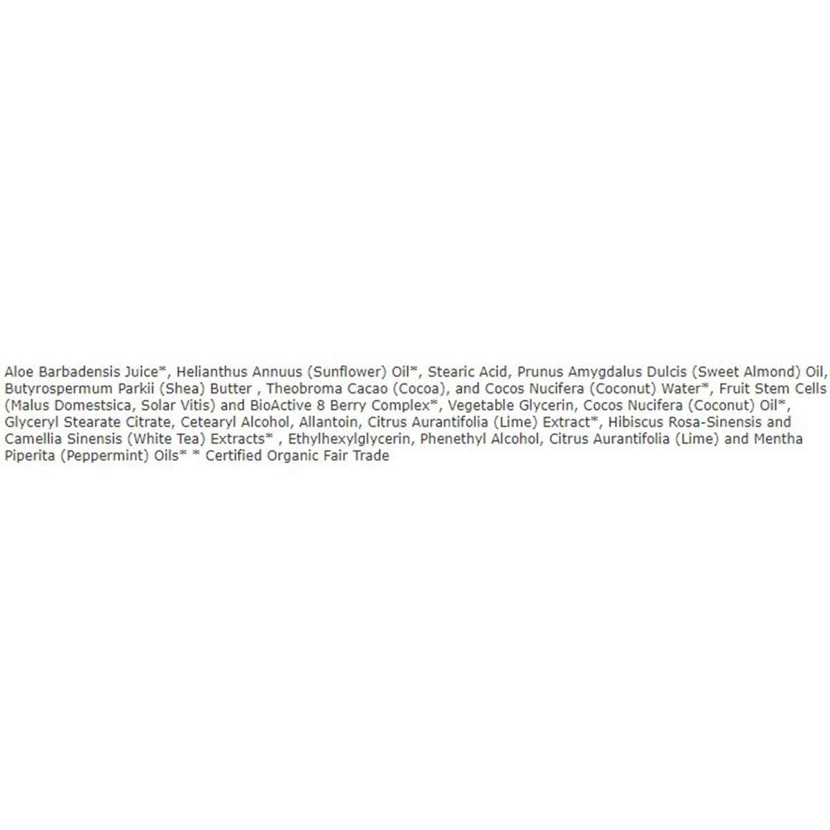 Aloe Barbadensis Juice*, Helianthus Annuus (Sunflower) Oil*, Stearic Acid, Prunus Amygdalus Dulcis (Sweet Almond) Oil, Butyrospermum Parkii (Shea) Butter, Theobroma Cacao (Cocoa), and Cocos Nucifera (Coconut) Water*, Fruit Stem Cells (Malus Domestica, Solar Vitis) and BioActive 8 Berry Complex*, Vegetable Glycerin, Cocos Nucifera (Coconut) Oil*, Glyceryl Stearate Citrate, Cetearyl Alcohol, Allantoin, Citrus Aurantifolia (Lime) Extract*, Hibiscus Rosa-Sinensis and Camellia Sinensis (White Tea) Extracts*, Ethylhexylglycerin, Phenethyl Alcohol, Citrus Aurantifolia (Lime) and Mentha Piperita (Peppermint) Oils*