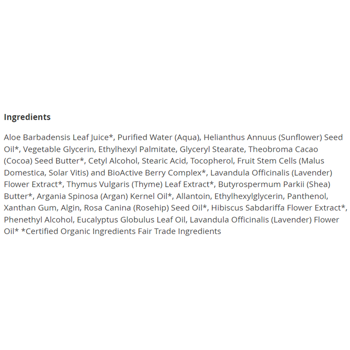 Aloe Barbadensis Leaf Juice*, Purified Water (Aqua), Helianthus Annuus (Sunflower) Seed Oil*, Vegetable Glycerin, Ethylhexyl Palmitate, Glyceryl Stearate, Theobroma Cacao (Cocoa) Seed Butter*, Cetyl Alcohol, Stearic Acid, Tocopherol, Fruit Stem Cells (Malus Domestica, Solar Vitis) and BioActive Berry Complex*, Lavandula Officinalis (Lavender) Flower Extract*, Thymus Vulgaris (Thyme) Leaf Extract*, Butyrospermum Parkii (Shea) Butter*, Argania Spinosa (Argan) Kernel Oil*, Allantoin, Ethylhexylglycerin, Panthenol, Xanthan Gum, Algin, Rosa Canina (Rosehip) Seed Oil*, Hibiscus Sabdariffa Flower Extract*, Phenethyl Alcohol, Eucalyptus Globulus Leaf Oil, Lavandula Officinalis (Lavender) Flower Oil* *Certified Organic Ingredients Fair Trade Ingredients.