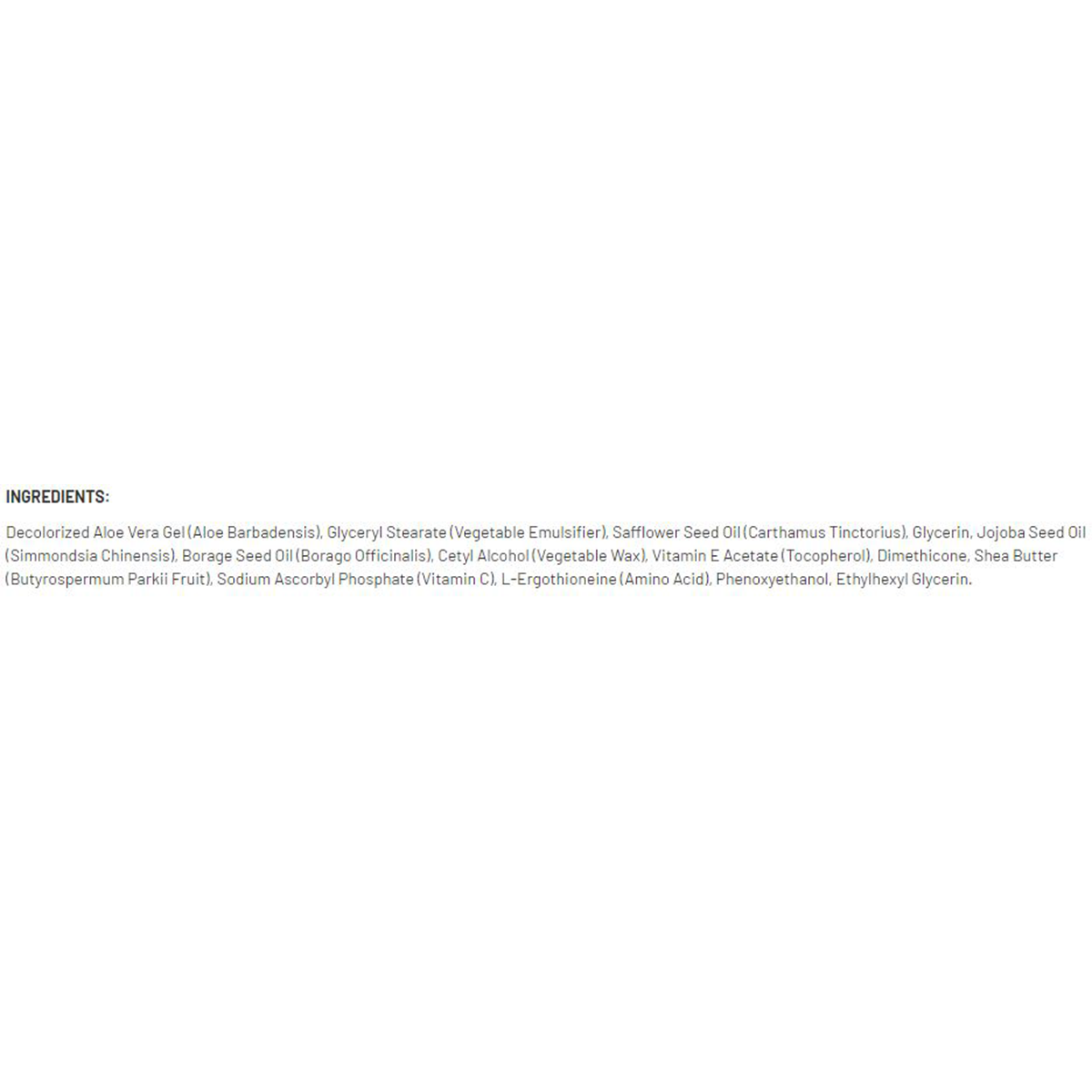 Decolorized Aloe Vera Gel (Aloe Barbadensis), Glyceryl Stearate (Vegetable Emulsifier), Safflower Seed Oil (Carthamus Tinctorius), Glycerin, Jojoba Seed Oil (Simmondsia Chinensis), Borage Seed Oil (Borago Officinalis), Cetyl Alcohol (Vegetable Wax), Vitamin E Acetate (Tocopherol), Dimethicone, Shea Butter (Butyrospermum Parkii Fruit), Sodium Ascorbyl Phosphate (Vitamin C), L-Ergothioneine (Amino Acid), Phenoxyethanol, Ethylhexyl Glycerin.