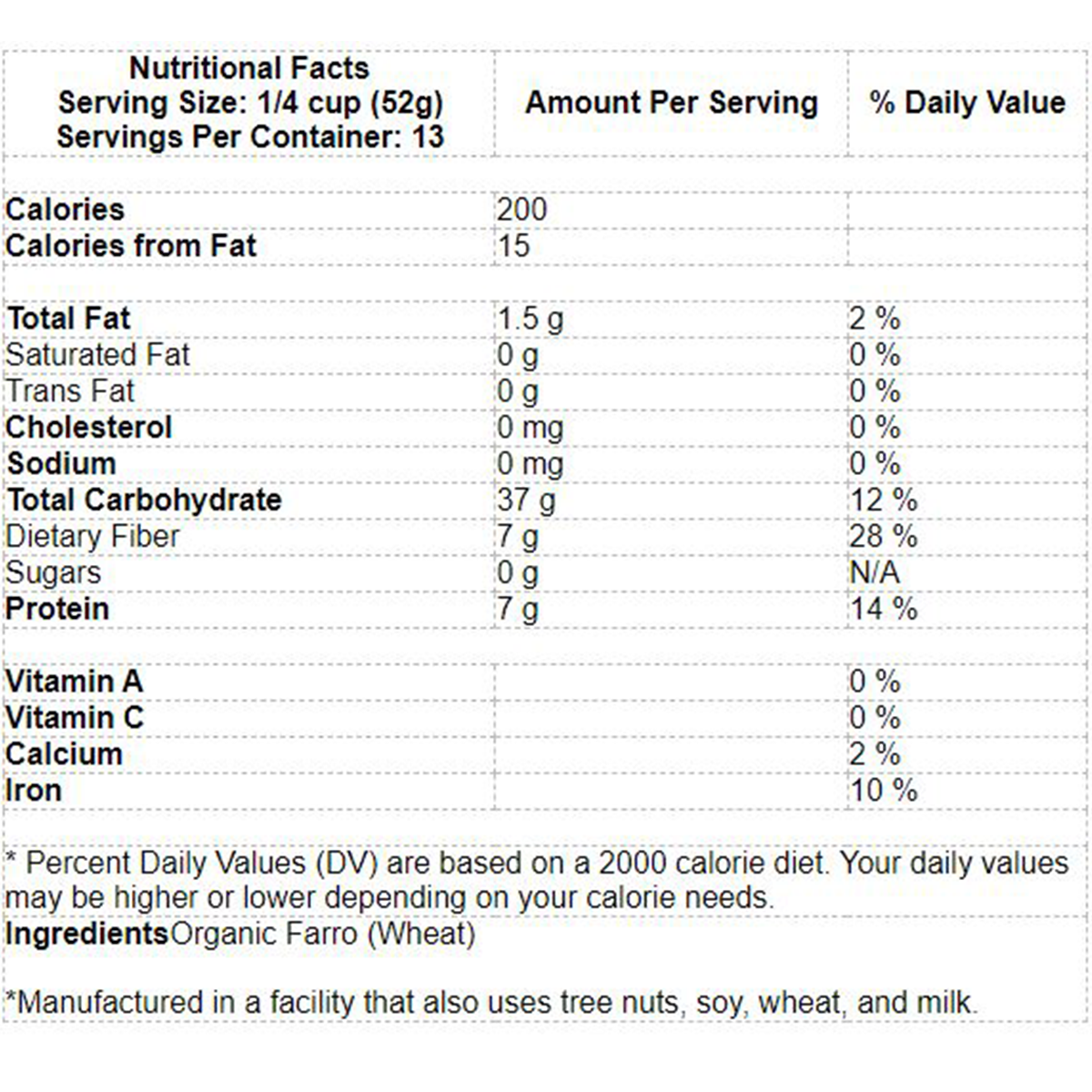 This organic farro, Triticum spelta, offers many health benefits including being a good source of iron. Farro is easy to digest, allowing your body to readily absorb the nutrients. Our farro is very lightly scratched, as is traditional, to allow for a faster cooking time and to encouIntensity the release of its starches during cooking, but it maintains all of the nutritional benefits of farro.