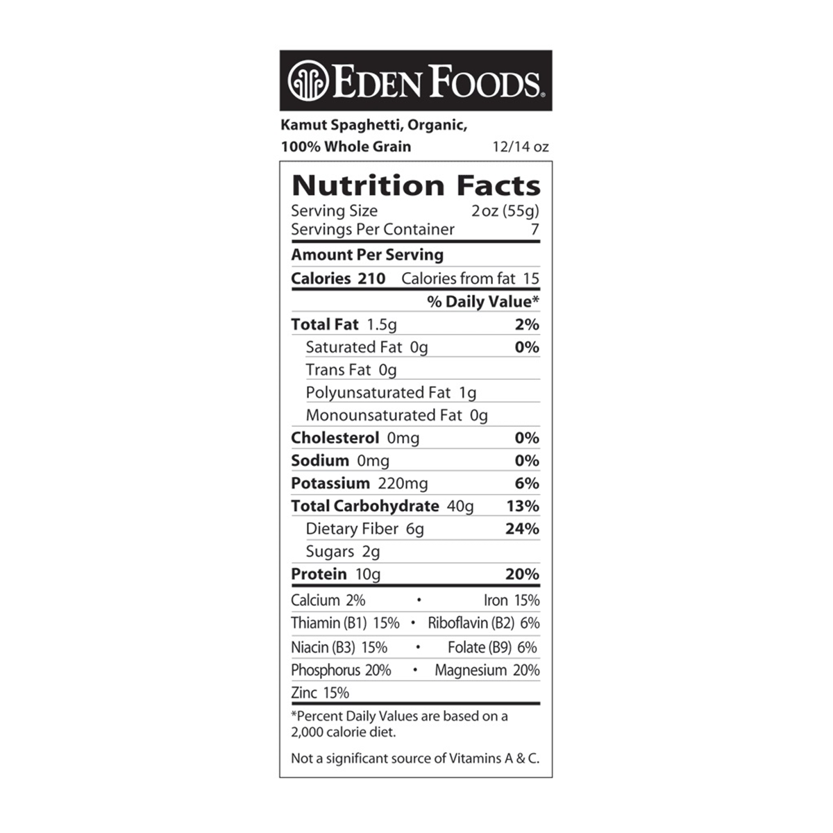 Exceptionally satisfying spaghetti of high plains family organic Khorasan (kamut) wheat, an ancient variety. Its large golden kernels make superior whole grain pasta with sweet flavor and a smooth texture. Many sensitive to modern wheat enjoy kamut. Made by the Eden Organic Pasta Company on vintage Italian equipment with brass dies and slowly air dried. Rich in thiamin B1, magnesium, zinc, copper, and manganese. A good source of protein, fiber, and iron. In a reclosable, recycled and recyclable box with a tasty recipe and its photo on the back.