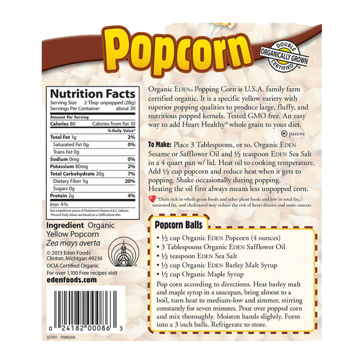 Family farm organic yellow popcorn. A superior popping variety makes large, fluffy popped kernels. Exceptional taste. A 100% whole grain alternative to a high fat, high sodium snacks.