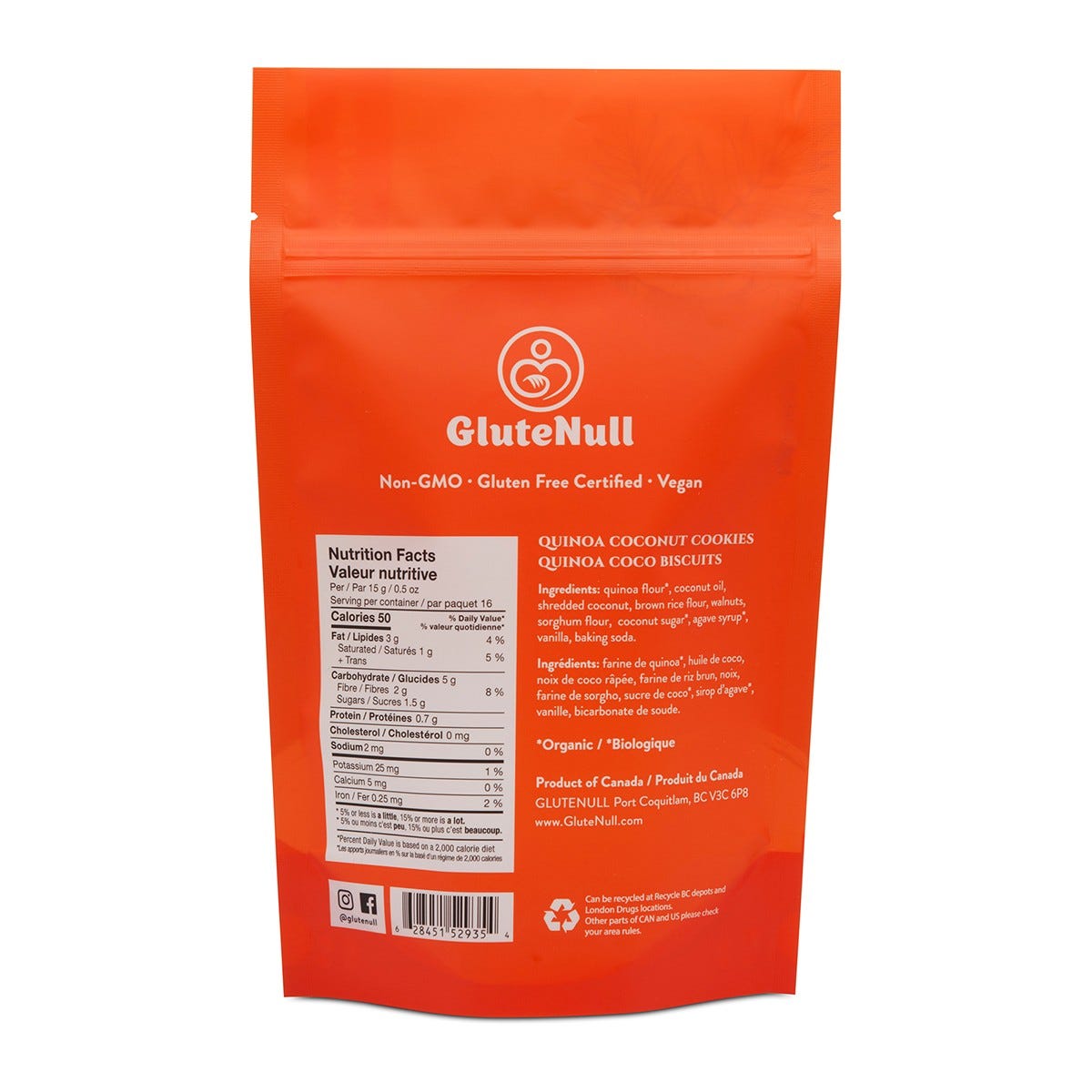 Organic quinoa flour, coconut oil, shredded coconut, brown rice flour, walnuts, sorghum flour, organic coconut sugar, organic agave syrup, vanilla, baking soda.