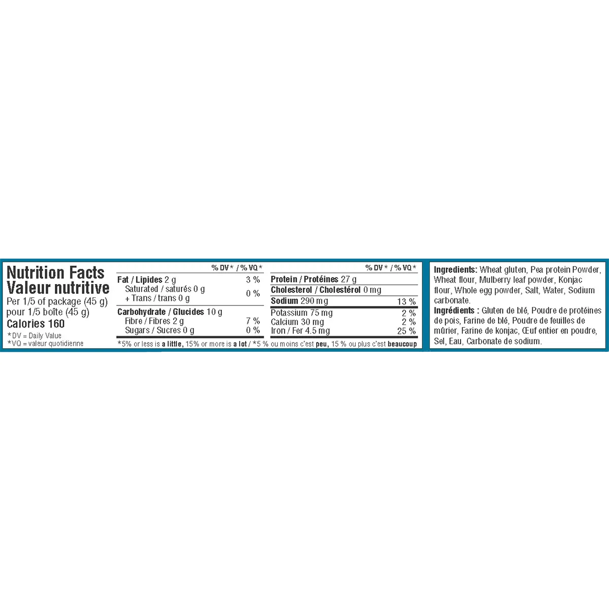 Wheat gluten, Pea protein Powder, Wheat flour, Mulberry leaf powder, Konjac flour, Whole egg powder, Salt, Water, Sodium carbonate.