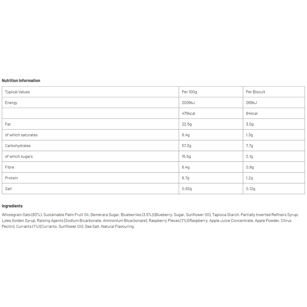 Wholegrain Oats (63%), Sustainable Palm Fruit Oil, Demerara Sugar, Blueberries (3.5%) (Blueberry, Sugar, Sunflower Oil), Tapioca Starch, Partially Inverted Refiners Syrup; Lyles Golden Syrup, Raising Agents (Sodium Bicarbonate, Ammonium Bicarbonate), Raspberry Pieces (1%) (Raspberry, Apple Juice Concentrate, Apple Powder, Citrus Pectin), Currants (1%) (Currants, Sunflower Oil), Sea Salt, Natural Flavouring.